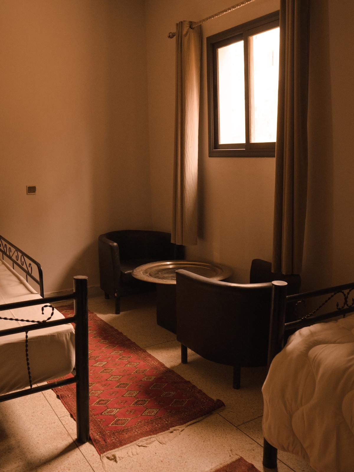 Our philosophy is based on lifestyle and comfort. This Double or Twin Private Room offers a warm and stylish retreat, perfect for both couples and friends. The room is equipped with two high-quality mattresses that can be arranged either as a double bed or two singles, depending on your preference. A hallway window brings in natural light, creating a fresh and welcoming atmosphere, ideal for relaxing after a surf session or a day exploring Taghazout.
