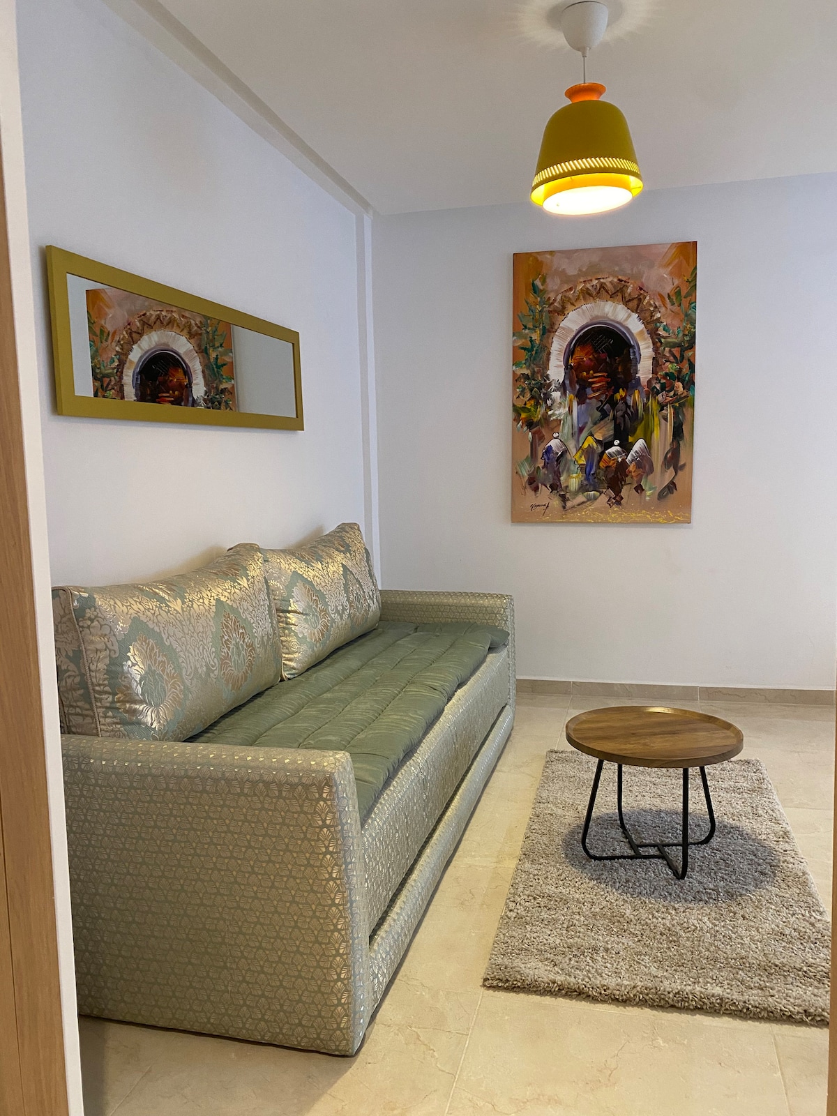 This one-bedroom apartment is perfect for solo travellers, couples, and surfers. The apartment is decorated with a minimalist style and features a spacious bedroom with a queen-size bed and ample storage space. The living room is bright and airy with 2 sofa beds, TV and kitchenette. The apartment is located in the heart of Tamraght, near "Hey Yallah Cafe" Walking distance from Devil's Rock, and a variety of shops, cafes & amenities