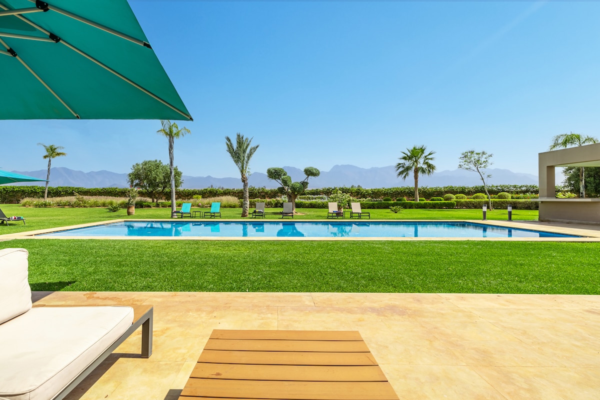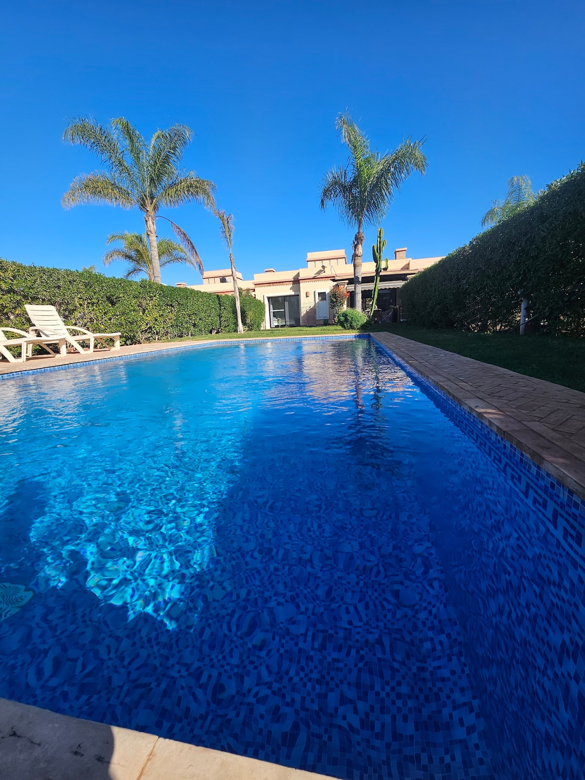 Superbe villa avec piscine au cœur d'une palmeraie. Elle se compose d'une grande pièce à vivre avec salon salle à manger et cuisine ouverte vue sur la piscine et la palmeraie, une chambre d'enfants avec un lit de 70 cm x 110cm, une grande chambre parentale avec un lit King size, une salle d'eau avec WC et douche à l'italienne. Une dépendance avec un lit de 140 cm et une salle d'eau avec WC et douche. Un pool housse comprenant une cuisine et une salle à manger d'extérieur. Pas de climatisation.