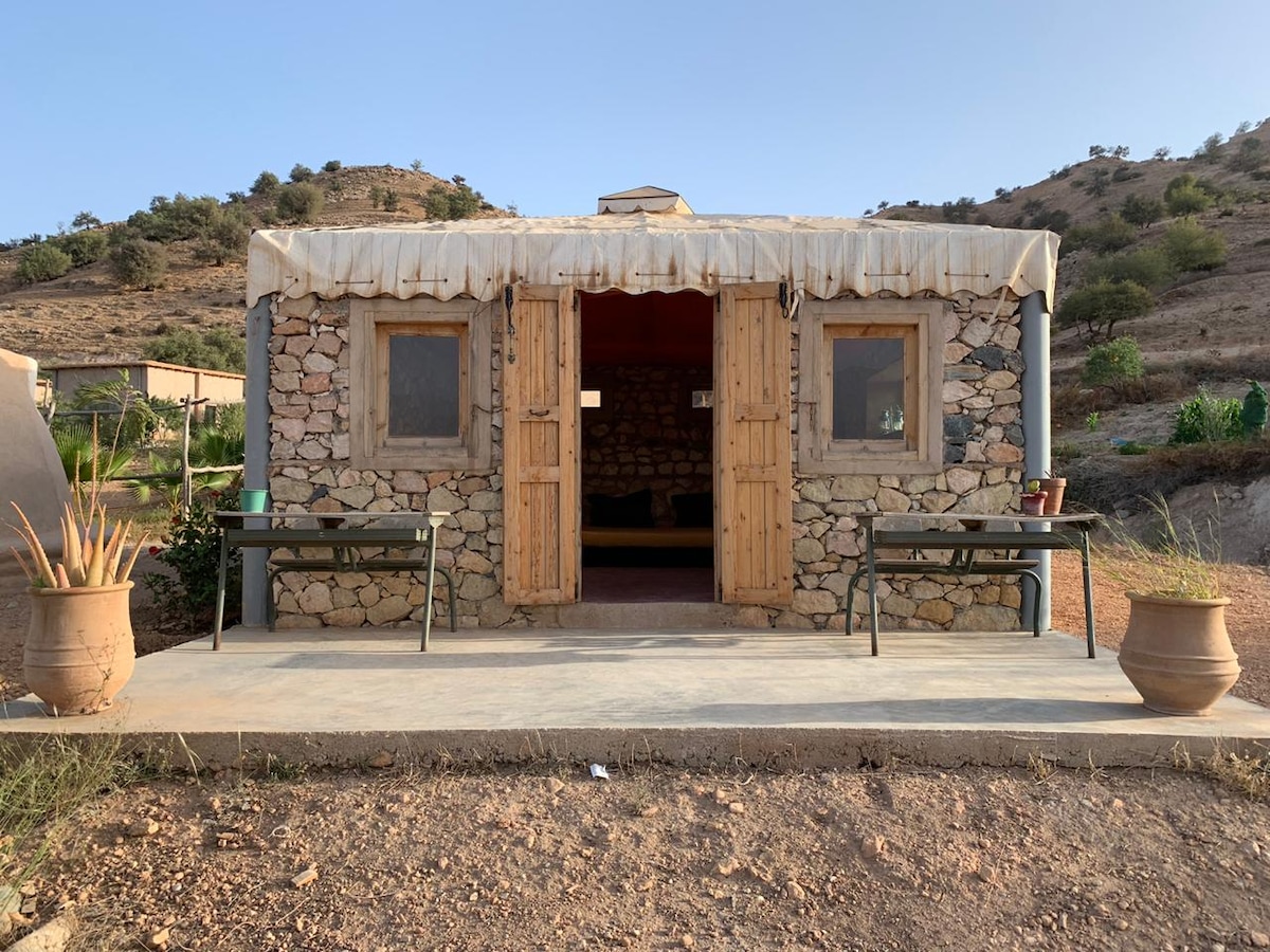 L'habitation est construite en pierre, le toit est constitué d'une toile de tente type caidale. Elle se situe en bordure du lac imi el kheng & face a l'Atlas. Nous ne sommes pas raccordés au réseau électrique, nous fonctionnons avec des panneaux photovoltaïques qui ne nous permettent pas de proposer de chauffage ni d'éclairer l'ensemble de la propriété (des couvertures sont fournies ainsi que des lampes)