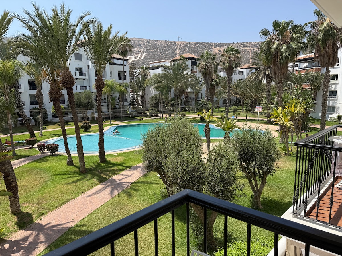 apartment, in the best area of Agadir, short walk from the beach and a short walk from the shopping center. There are some amazing and clean cafes / restaurants within walking distance of the apartment. You are secured 24 hours a day and access to 2 pools. an amazing place to live with an amazing sense of community. Suitable only for Professionals /couples and families /No men’s group will be accepted.