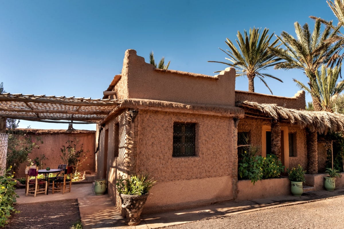 Located in the palm grove of Ouarzazate this small house of Berber style will enchant you for its charm and comfort. Calm, relaxation, meetings with our animals are guaranteed. With swimming pool and garden shared with other travelers. Breakfast included, air conditioning/heating, wifi, terrace and free secure parking. A bedroom with 1 double bed + 3 single beds. A convertible living room with 2 single beds and an equipped kitchenette. Ideal for lovers of nature and authentic.