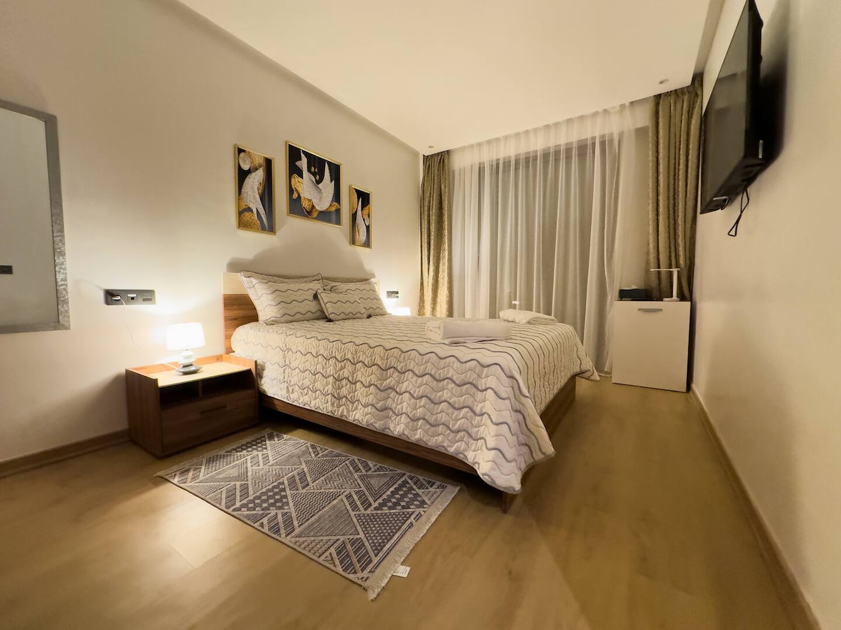 Chill and relax in this calm, stylish space with all the amenities you need for a comfortable stay . Two cozy bedrooms with a private balcony overlooking the city skyline, with access to an indoor pool. Located in the heart of the city just 10 minutes away from the beach with a fully equipped kitchen and a comfortable living area featuring a big screen smart TV with access to Netflix and all TV channels . The flat comes with a VIP underground parking spot located just 5 meters from the elevator.