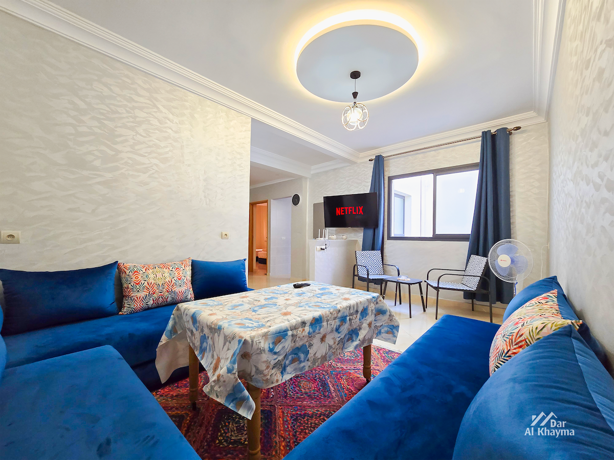 Offrez-vous un séjour reposant dans ce bel appartement climatisé, idéalement situé dans un quartier calme et sécurisé, à moins de 10 minutes de la plage. Vous serez à proximité immédiate des commerces : Marjane et Carrefour, de nombreux restaurants, salles de sport, spa et hammam également disponibles à quelques minute.Situé au 4ᵉ étage avec ascenseur, l’appartement offre une vue dégagée et un grand confort. Profitez d’un espace moderne avec tout le nécessaire pour un séjour agréable wifi fibre
