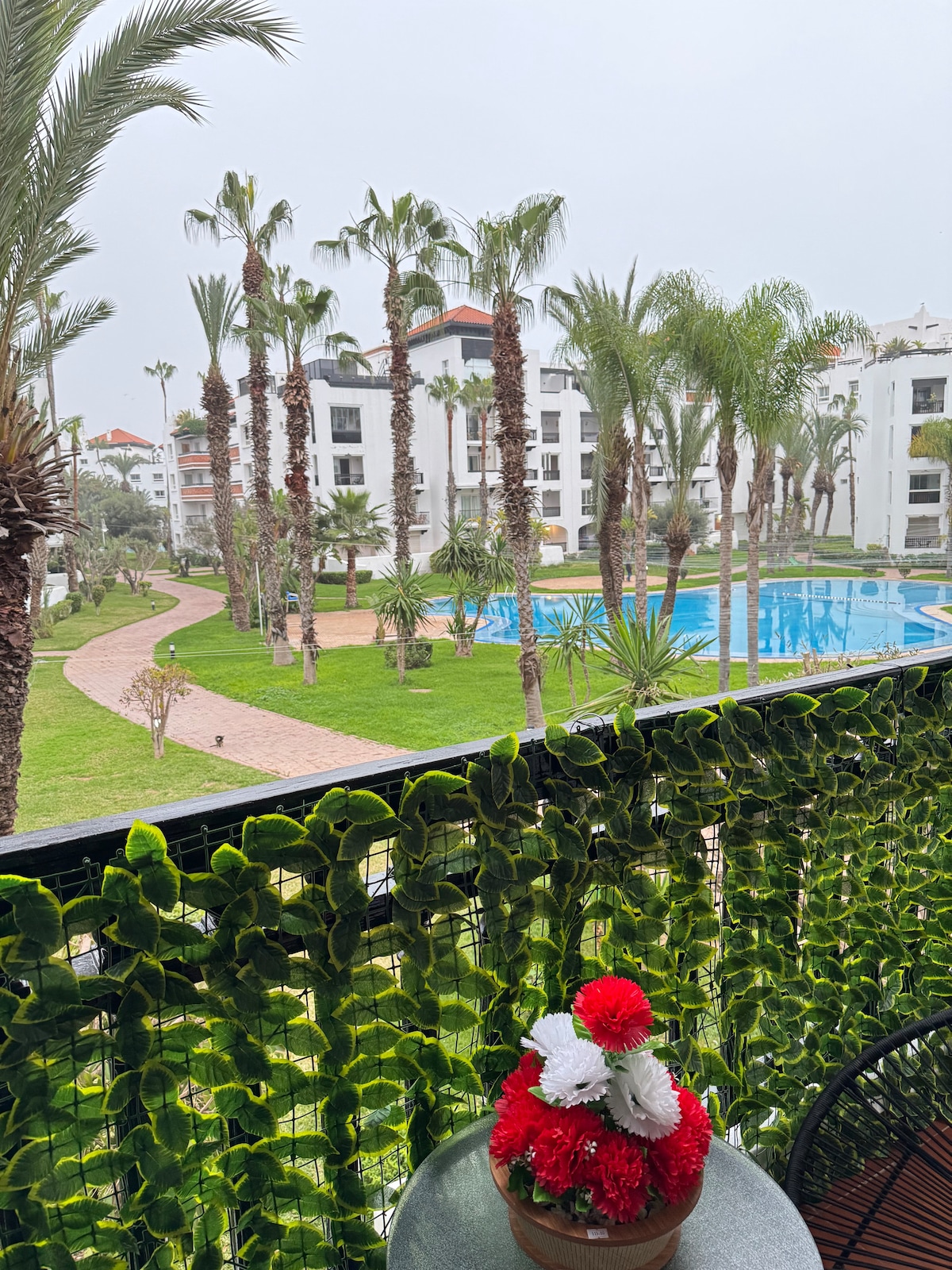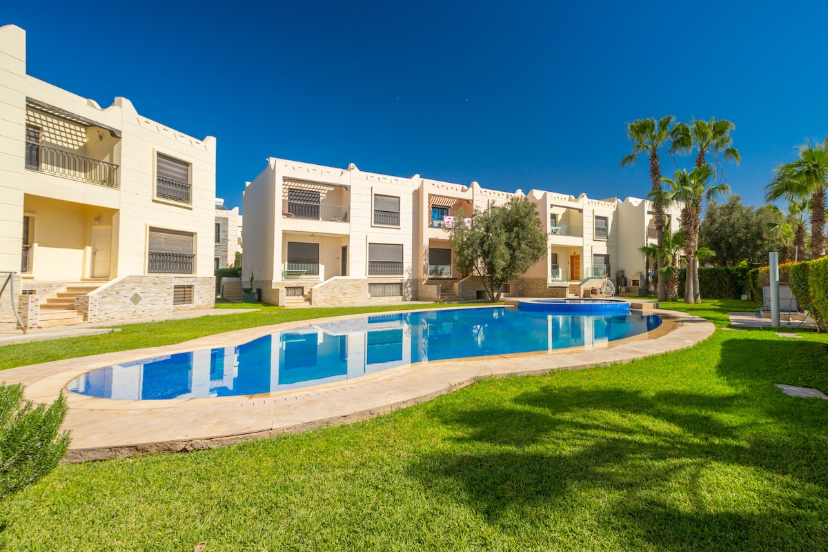 appartement de haut standing dans l endroit le plus prisé d Agadir vous trouverez à proximité ,cafés restaurants ,plage ,spa et hamam. lappartement est idéal pour 4 personnes mais peut accueillir jusqu a jusqu'à 6 personnes L appartement est équipé d une tv led curved,des chaînes satellites (tf1 M6 canal Beinsport ), wifi, 1 grande piscine dans la résidence ,parking gratuit,gardiens 24/24