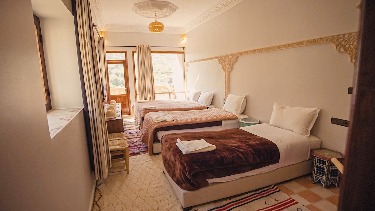 Perfect for friends, our triple room features three separate single beds and a private bathroom. Enjoy the peaceful atmosphere and stunning mountain views. The room offers easy access to the pool, making it an ideal space to relax after a day of exploring the Atlas Mountains. Relax, recharge, and enjoy your stay with friends in comfort.
