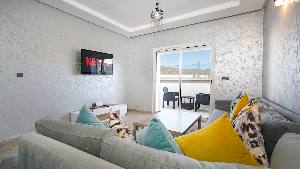 Sunny 1st-floor apartment in central Agadir, steps from cafés, shops, and a 10-minute walk to the beach. Enjoy a cozy living area with a 65'' TV, fast WiFi, and a full kitchen. We help you plan unforgettable experiences: camel rides, Agadir Sahara sunset & sandboarding, Paradise Valley trips, surf, skate, quad, jet ski, fishing & more. Airport transfer service available. ⚠️ Only registered guests are allowed, no outside visitors.