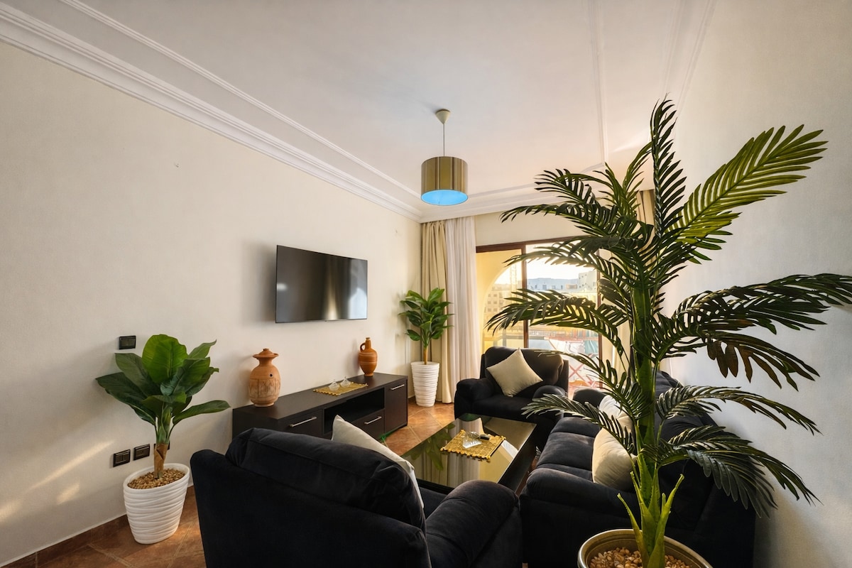 🌞 Appartement ensoleillé plein sud avec vue dégagée sur la piscine, situé au cœur de la Marina d’Agadir. Dans une résidence calme, sécurisée et très recherchée, avec piscines, jardins et accès direct à la plage. Idéal pour un séjour reposant en couple, en famille, entre amis ou pour un séjour prolongé. Restaurants gastronomiques, street-food salons de thé et commerces à pieds Sunny south-facing apartment with a pool view, located in the heart of Agadir Marina.