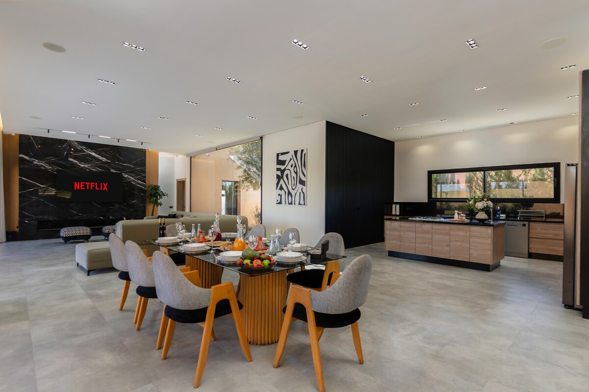 Évadez-vous dans notre villa de luxe pour 8 à 10 personnes, alliant design moderne et charme marocain. Profitez de 4 chambres élégantes, d'un hammam privé en marbre, d'un grand jardin paysager et d'un accès à une piscine commune. Située dans une résidence sécurisée près du Golf du Soleil, cette villa offre un confort 5 étoiles avec climatisation et fibre optique. L'oasis parfaite pour une détente absolue.