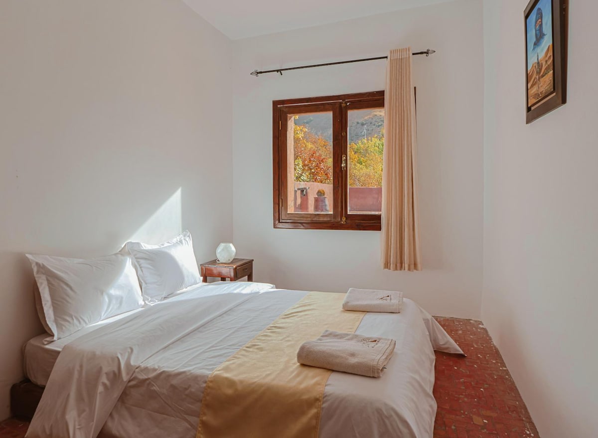 Notre riad "AL MAASSRA" vous invite au coeur d'un village typique, entouré de murs à l'abri des regards, construit sur un ancien moulin à olives. Doté d'un jardin ombragé et arboré, avec une fontaine, un hammam et une piscine sans vis-à-vis avec des bains de soleil... Plusieurs espaces de vie et de repos sont à votre disposition dont un coin repas sous une pergola, un salon atypique avec son moulin et sa cheminée, un salon contemporain... Les 4 chambres sont climatisées. Barbecue à disposition