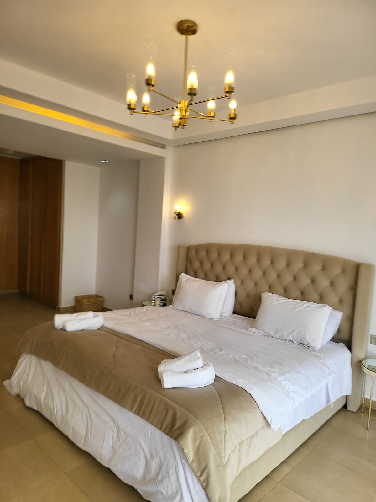 Appartement à la Marina d'Agadir avec 3 piscines, doté de deux chambres bien aérées, deux salles de bain, et un salon spacieux, élégant et climatisé. Profitez d’une vue panoramique exceptionnelle sur la plage d’Agadir depuis une terrasse et une vue sur la piscine sur l’autre. Idéal pour des séjours mémorables, cet appartement allie confort, raffinement et emplacement privilégié au cœur de la Marina, à proximité des restaurants chics, commerces et des attractions.