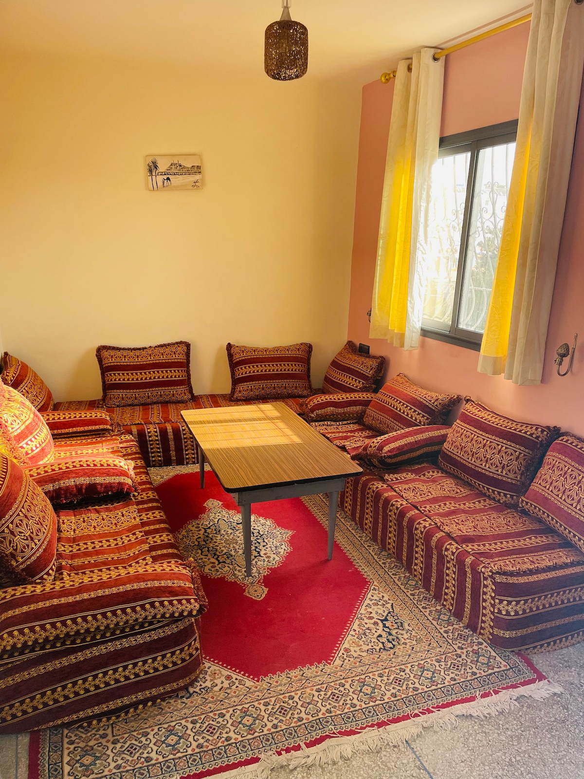 The apartment offer's private bathroom and shower with kitchen, one bedroom apartment with a large living room. in total this space can accommodate up to 4 people. two sleeping in the bedroom and other two in the living room space that offers two sleeping beds. the House offer a beautiful large garden with a swimming pool with an amazing inside living room space for yoga or dancing, where we make special events sometimes, with Roof-top terrace overlooking Agadir city 20km away