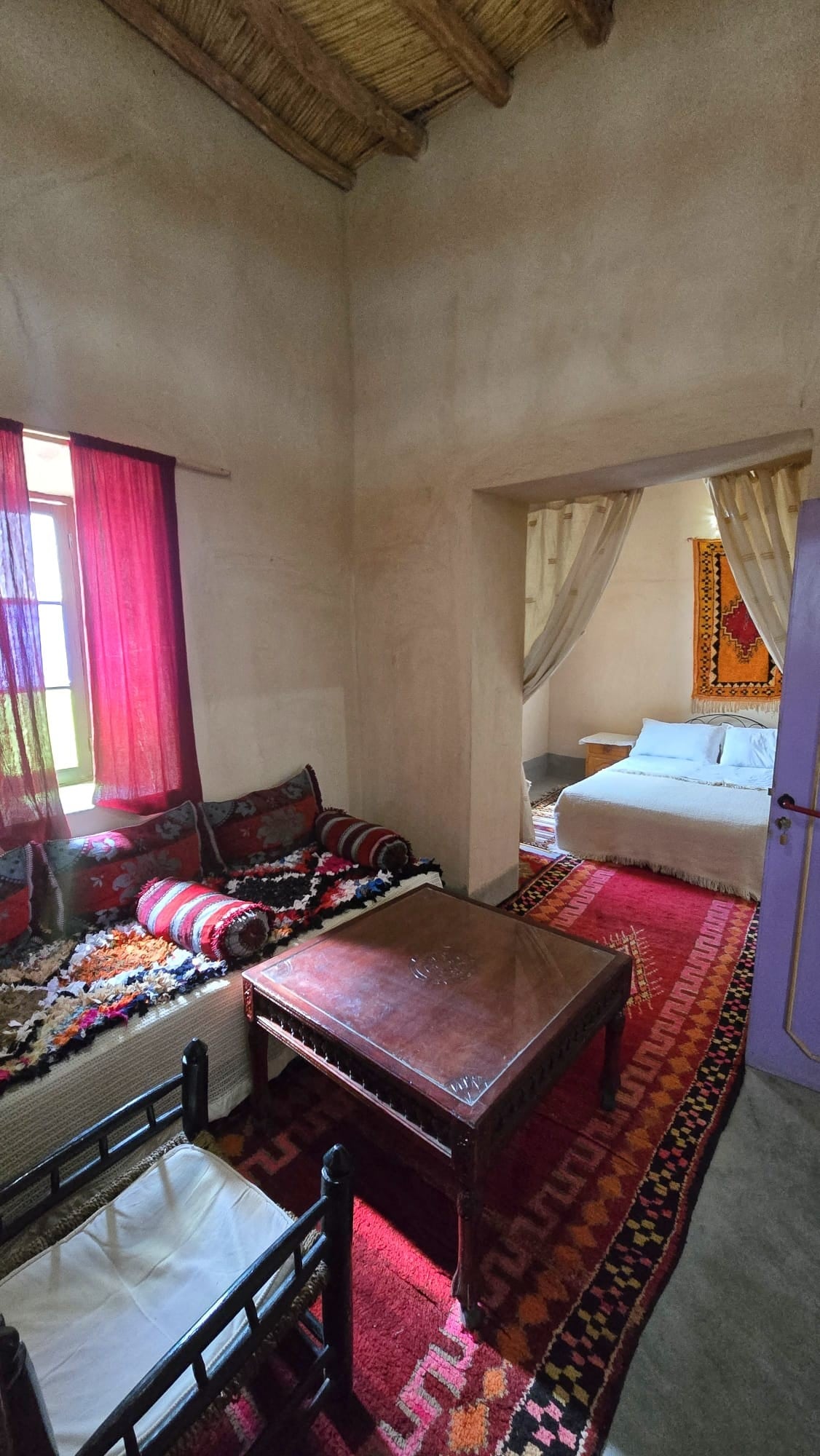 Dar Sidra est un lieu apaisant situé à Douar Tiguert avec vue imprenable sur la vallée, les jardins et le vieux village, à seulement 10 minutes du Centre Ait Ben Haddou. Il offre un espace idéal pour se ressourcer. L’appartement climatisé dispose d'une chambre équipée d'un grand lit avec matelas de qualité. - Un séjour avec un canapé convertible deux places. - Une salle de bain avec douche, WC, serviettes fournies - Un accès wifi gratuit possibilité repas et petit déjeuner.