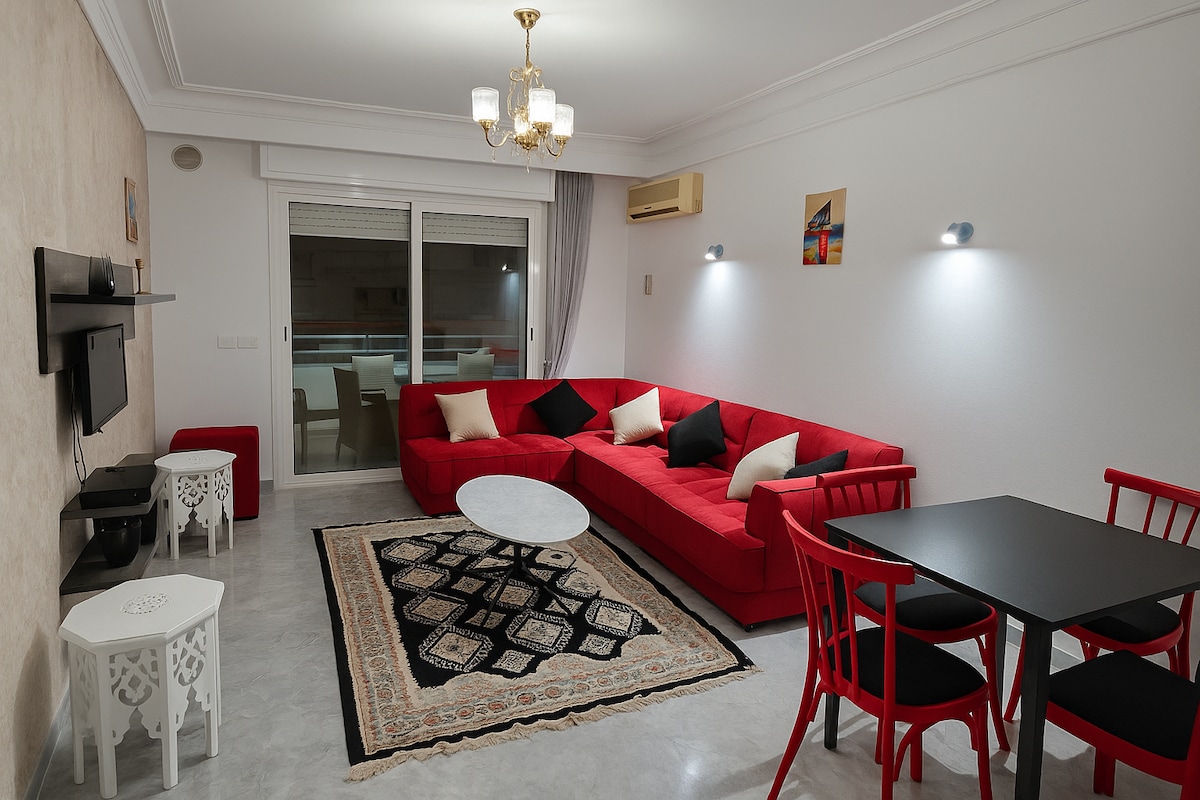 Apparemment tout neuf a 200metres de la plage dans un immeuble de haut standing, un appartement offre un confort haut de gamme…dispose d’un salon a double canapé Cuisine bien équipé..salle de bain avec une douche italienne spacieuse..une chambre avec un lit king size…l’appartement est climatisé et dispose d’un chauffage central…un balcon a vue sur mer…et loin de tout nuisance. tout près de la plage..les boites de nuits.restaurants et les cafés. ce qui lui confère un charme sans pareil