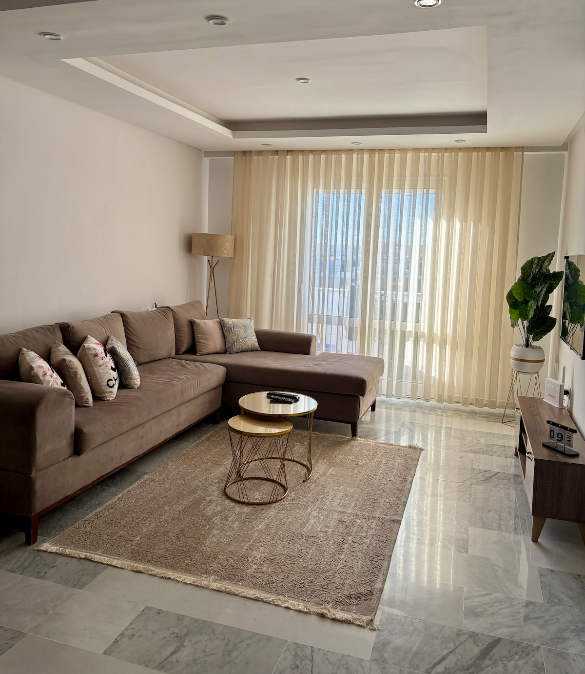 Enjoy a modern, haut standing apartment in the heart of Sahloul — calm, comfortable, and just steps away from trendy cafés, restaurants, and shops. Located in a secure residence with 24/7 cameras and a coded entrance . Living Room: Smart TV, AC, heating, dining table Room 1: Big bed, wardrobe, mirror, AC, heating Room 2: Big bed, baby bed, wardrobe, mirror, heating Kitchen: Fridge, oven, gas, coffee machine, boiler, fully equipped Bathroom: Bad Balcony: Nice view, washing machine