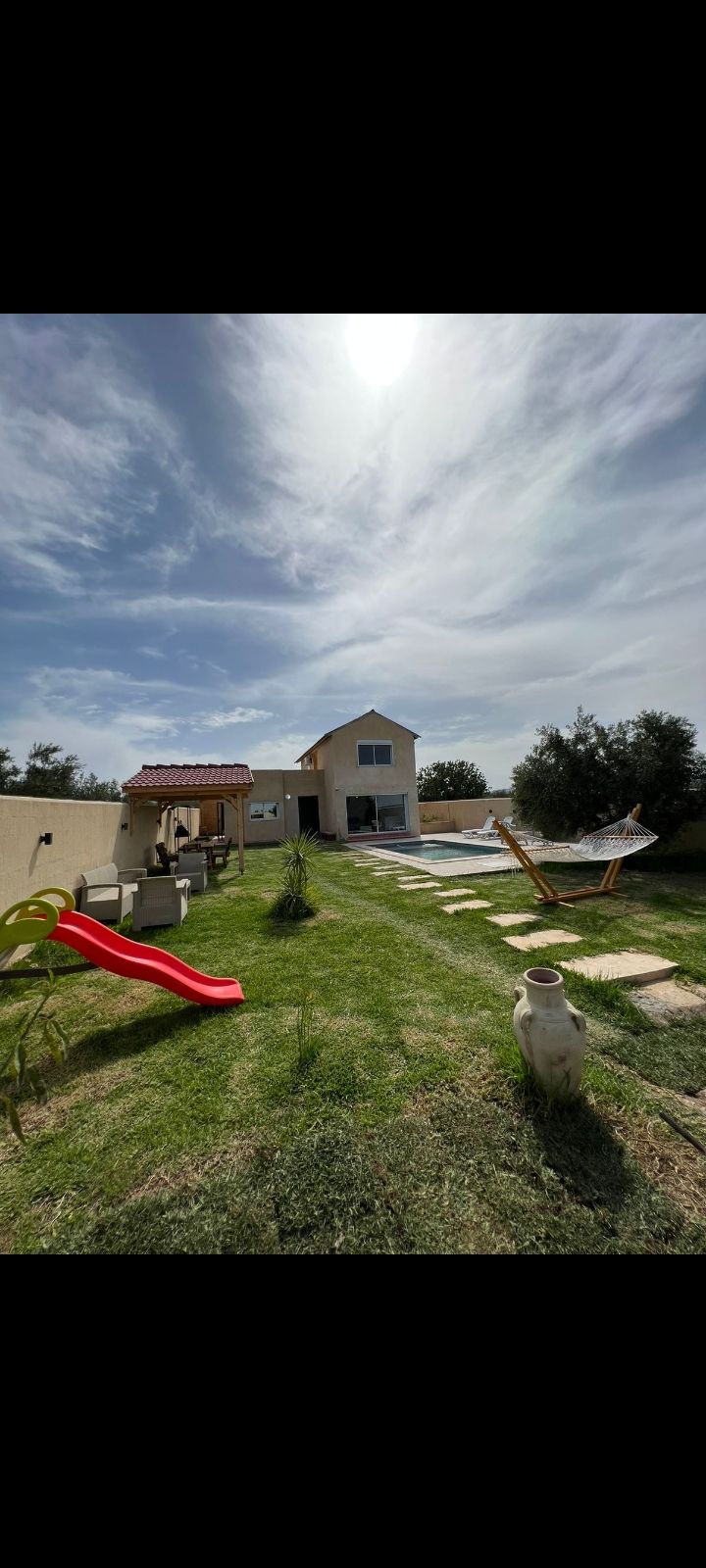 Très belle maison neuve avec jardin et piscine, à 5mn à pied d’une plage vierge, à proximité d’hôtels (hasdrubal/al Hambra) parc d’attraction et restaurants. La maison est de style méditerranéen, entièrement équipée, avec cuisine moderne, une cheminée au milieu d’un grand salon qui donne sur le jardin. Une salle d’eau avec douche et une chambre avec lit double au Rdc. Aux étages deux suites avec terrasses et vue sur mer, deux chambres et une salle de bain équipements bébé et enfants prévus