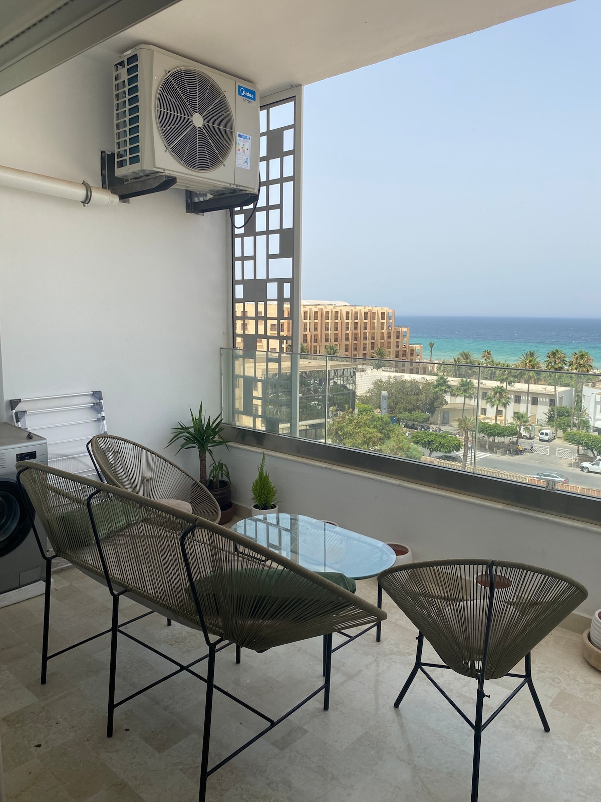 Beautiful and fully furnished apartment 5 minutes walk from beach. The location is perfect, between the touristic zone, the beach and the old city (Medina). Everything can be reached by walking including restaurants, shops, supermarkets, bars, the beach and souk. Safe neighborhood for evening strolls and nights out. This 80-square-meter apartment has 2 bedrooms, a living room, kitchen, dining room, bathroom and a balcony. The entire flat, living room and two bedrooms has air conditioning