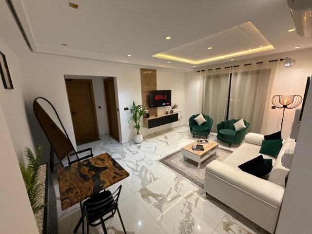 L’appartement se trouve dans le meilleur quartier de Sousse, à cinq minutes du port. On y trouve le parc d’attraction, les acqua park et plusieurs activités accessibles à pied. La résidence est sécurisée et l’environnement est calme. L’appartement a une très belle vibe on s’y sent détendu, comme chez soi. On peut y voir l’aube, le coucher de soleil et une vue agréable même la nuit. C’est un endroit où l’on peut profiter de la nature et d’une touche de luxe en même temps.