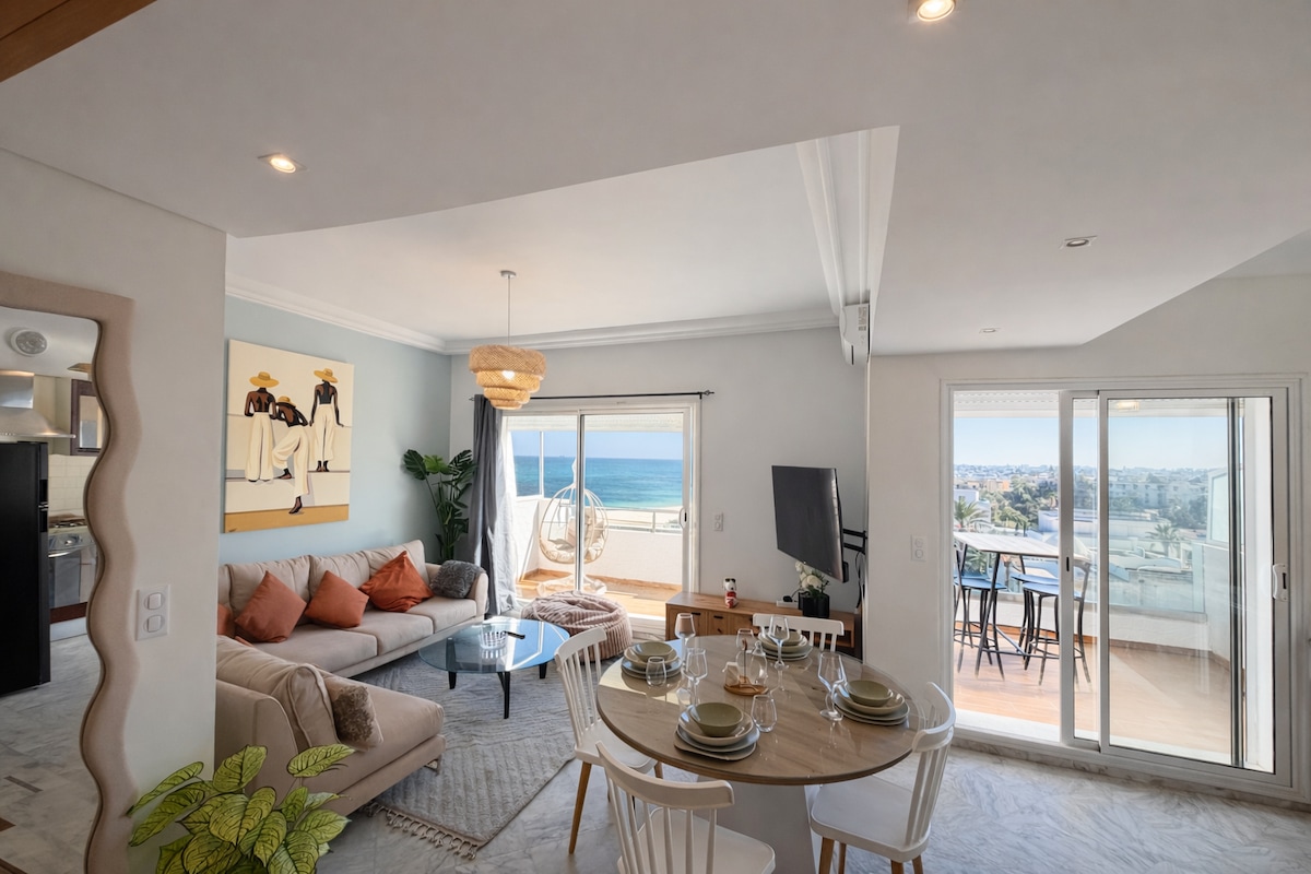 Discover a luxurious sea-view apartment in the city's heart. Wake up to Mediterranean panoramas from two bedrooms and enjoy coffee on a stunning terrace overlooking the coast. Located near The Medina and few minutes by taxi from Port El Kantaoui, this stylish space offers high-end furnishings, a well-equipped kitchen, WiFi, Smart TV, and modern comforts Two king-size bedrooms, an Italian-style bathroom, and workspace ensure a perfect urban retreat with easy access to cafés, restaurants, and bars