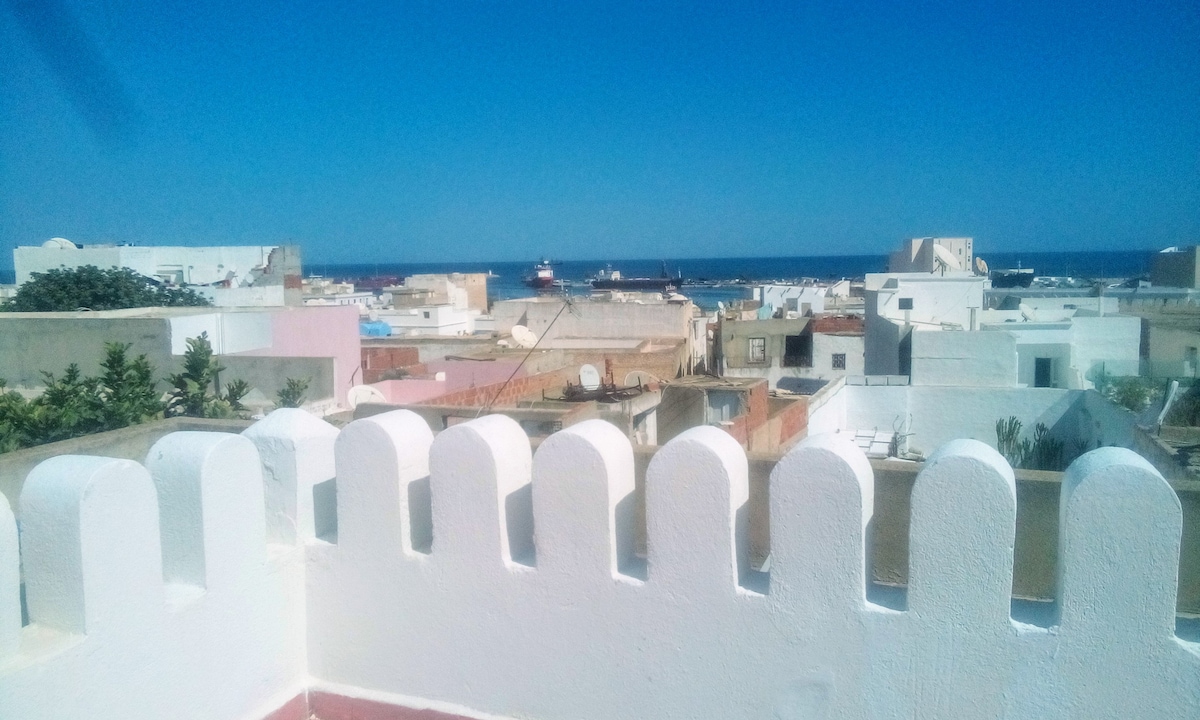 Meine Wohnung in der Altstadt von Sousse liegt im obersten Stock eines dreistöckigen Hauses und ist im typisch tunesischen Stil eingerichtet. Vom Balkon und von der Dachterrasse bieten sich Ausblicke auf die ganze Stadt und auf das Meer. Singles und Paare können hier ideal Kultur- und Strandurlaub kombinieren. Die historischen Bauten der Medina, der Badestrand und zahlreiche Einkaufsmöglichkeiten sind zu Fuß erreichbar, ebenso Bahnhof, Metro- und Louage-Station.
