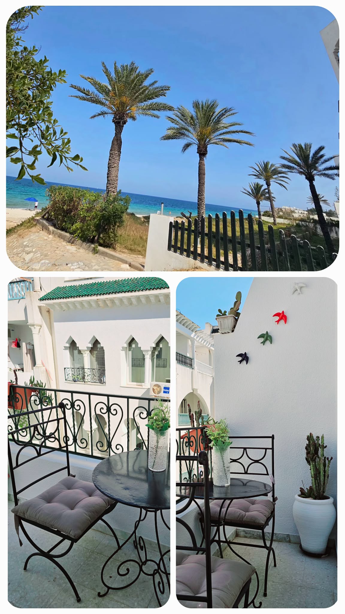 Enjoy a modern, haut standing apartment in the heart of Sahloul — calm, comfortable, and just steps away from trendy cafés, restaurants, and shops. Located in a secure residence with 24/7 cameras and a coded entrance . Living Room: Smart TV, AC, heating, dining table Room 1: Big bed, wardrobe, mirror, AC, heating Room 2: Big bed, baby bed, wardrobe, mirror, heating Kitchen: Fridge, oven, gas, coffee machine, boiler, fully equipped Bathroom: Bad Balcony: Nice view, washing machine