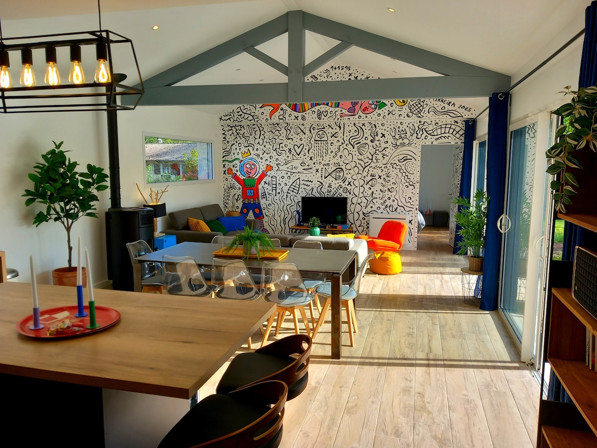 Maison coup de coeur entre océan et forêt, lumineuse au calme sur 1500 m² arborés. Terrasse plein sud sans vis-à-vis, BBQ électrique, salon de jardin. 3 chambres dont une suite parentale. Grande pièce de vie baignée de lumière avec clim, cuisine équipée et sa fresque originale signée TOTO. 2 salles de bain, buanderie, garage fermé. Idéalement située , a moins de 10min des plages . Un lieu unique pour se détendre et profiter en famille ou entre amis. Posez vos valises et savourez la vie :)