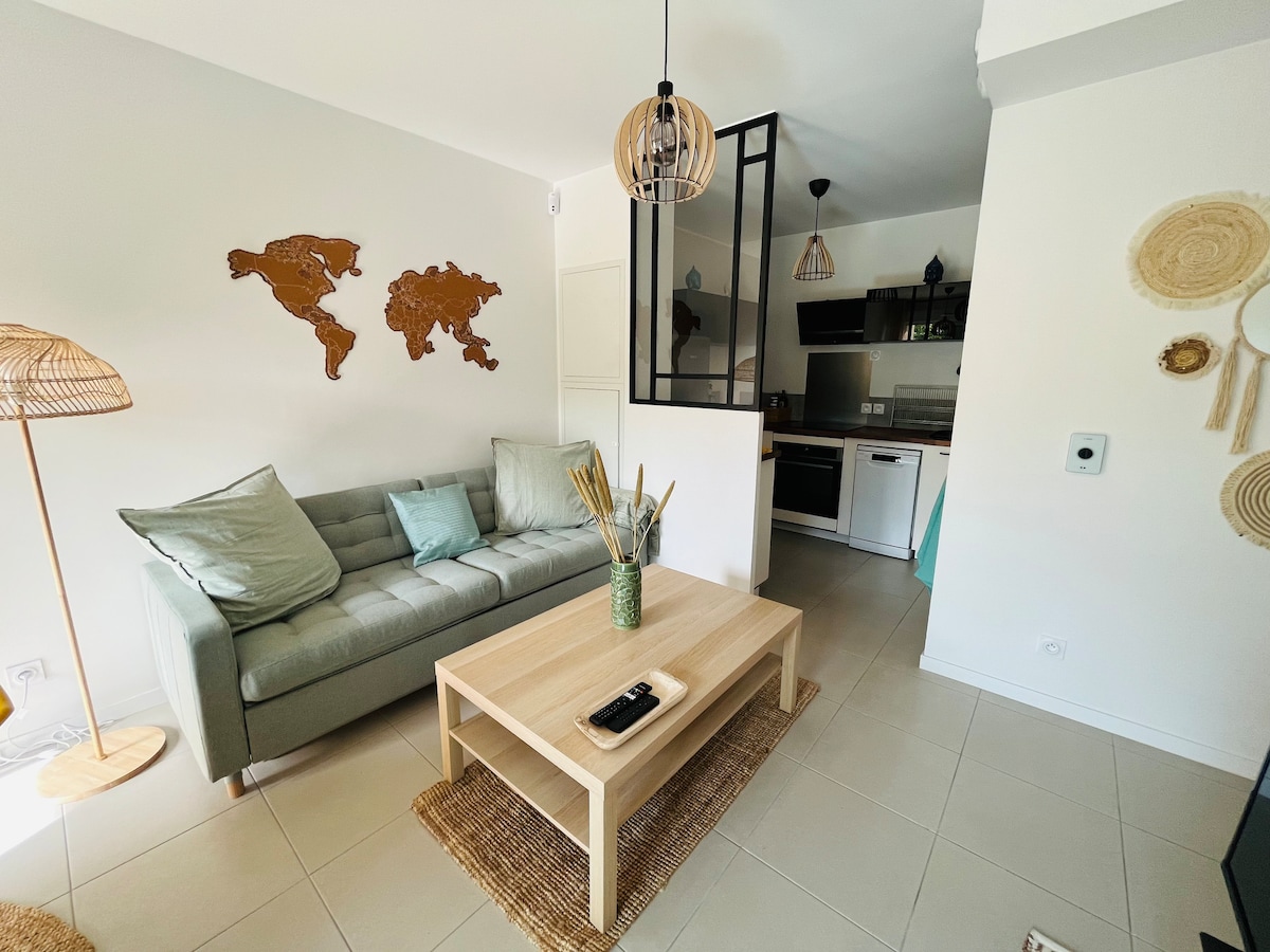 🎖 Charmant appartement 2 pièces climatisé, idéal pour 4 personnes situé à 2 minutes du lac de Soustons et à 10 minutes des plages. Le repos des pins se situe dans un environnement calme et paisible. - Cuisine entièrement équipée haut de gamme. - Salon avec canapé convertible de qualité, TV connectée, ainsi que d’une chambre confortable. - salle de bain moderne avec douche à l’italienne en traviertin. Parfait pour un séjour paisible et relaxant, en couple ou en famille, au cœur des Landes.