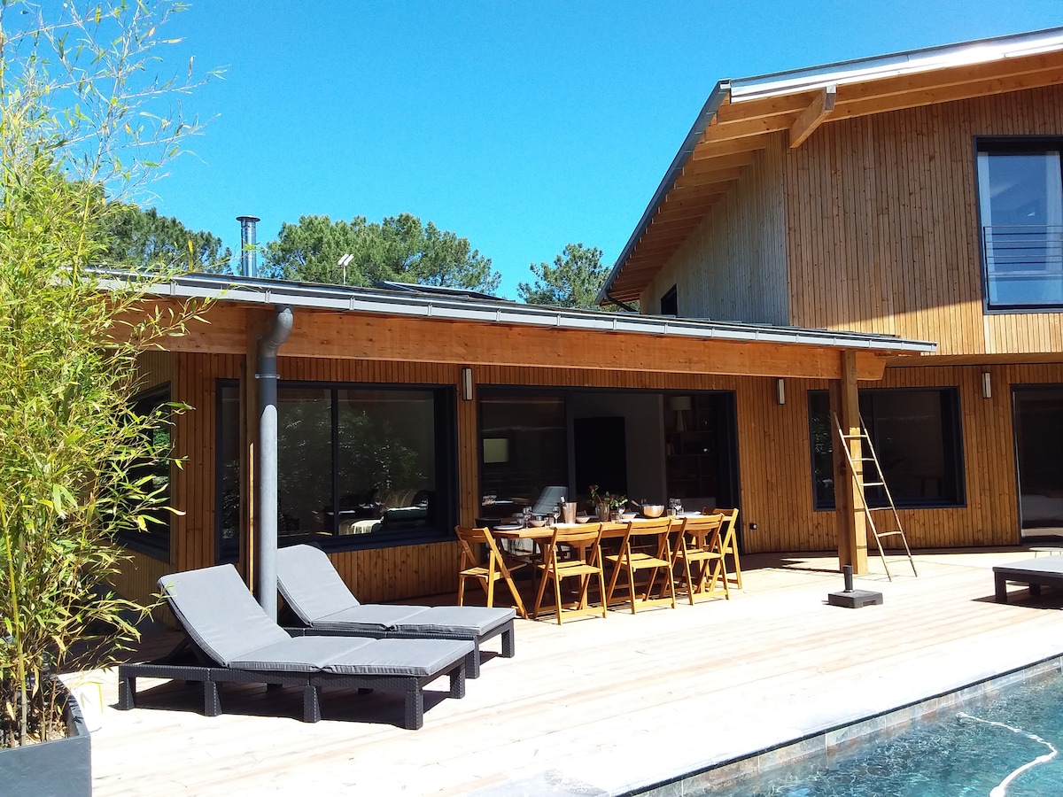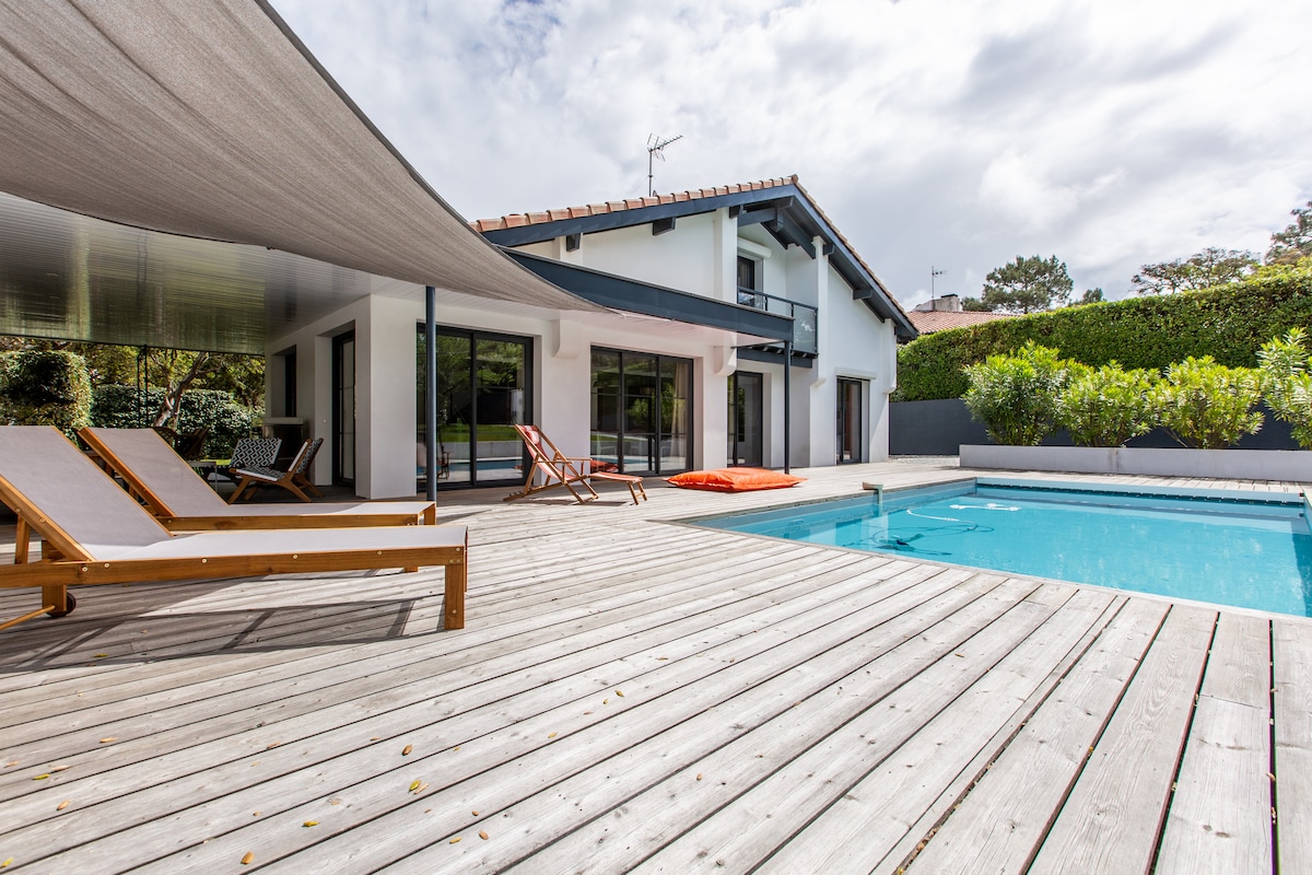 Linge de maison (lits faits) et ménage compris. Bienvenue dans notre villa contemporaine de 110 m², classée 4 étoiles, climatisée, avec piscine au sel chauffée. Nichée dans un écrin de verdure, dans le secteur Hossegor, Seignosse. Idéale pour des vacances en famille ou entre amis. Vous serez accueillis par Catherine de la Conciergerie de l'Etang Blanc qui sera disponible si besoin tout le long de votre séjour. Heures d'arrivée et de départ flexibles hors juillet/août, n'hésitez pas à demander.
