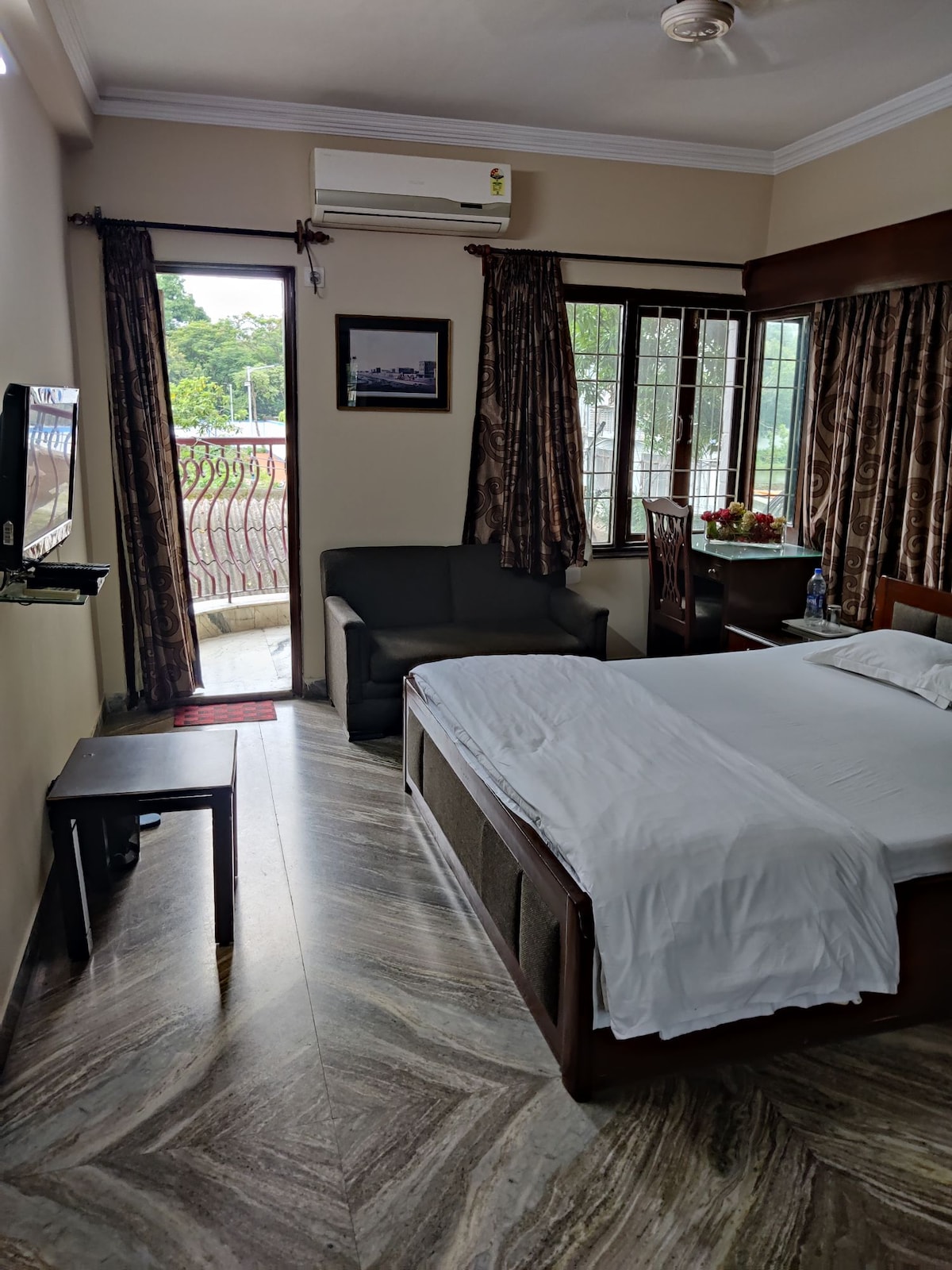 This room is a part of our guesthouse located in the heart of the city in park Street Area. The room comes with a big bed comfortable to accommodate two. The room is equipped with wifi, a cupboards with hangers, sofa chairs, LCD TV. It has an attached bathroom which has a geyser, shower and fan. Its opposite Kala mandir. The place has a full time caretaker who is warm and caring. Fresh home cooked breakfast is included while other meals can be ordered at affordable rates. Laundry available