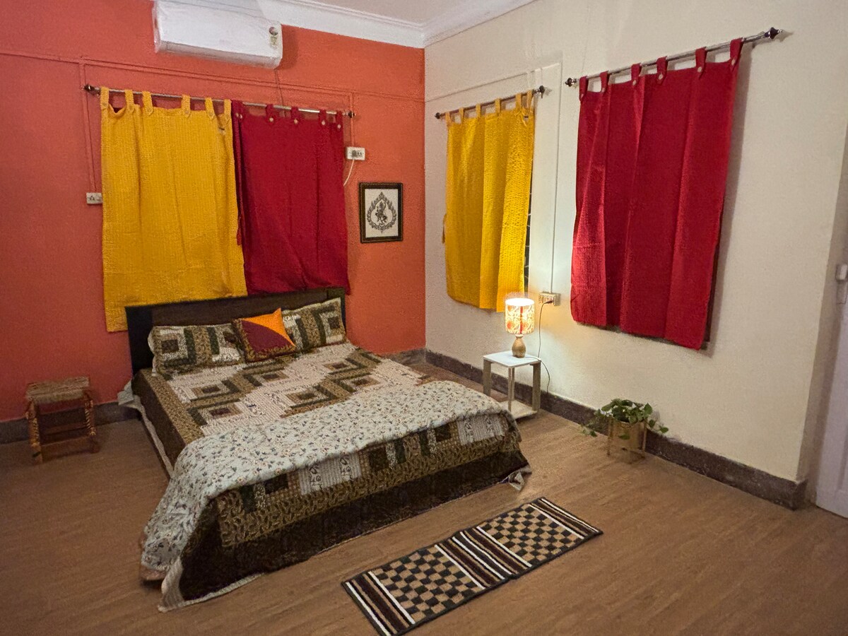 Forget your worries in this spacious and serene space. A Vintage one-bedroom ground-floor residence in a 2 storey House with a private bathroom, kitchen, dining area, and large balcony. Suitable for solo women travellers, professionals, tourists, students, couples married or unmarried, and LGBTQ guests. Great location, just up the road from South City Mall, Jadavpur University, AMRI Hospital, and many other popular places with good availability of transport.