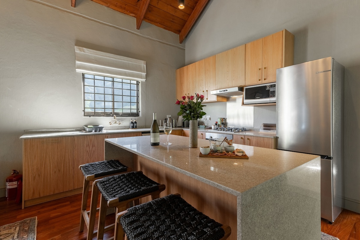 Situated on a small holding 5km outside Franschhoek, opposite the exquisite La Motte Wine Estate, Heidi’s Barn offers the perfect self-catering base from which to explore the Winelands. A fire pit, outdoor dining area and a large swimming pool (shared with one other cottage) are perfect for summertime relaxation while an indoor wood-burning fireplace and wooden floors throughout make for a cosy winter escape. The barn runs on mains power with solar back up for load shedding.