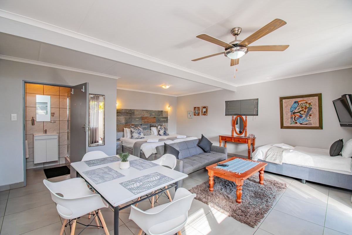Ideal for 2 people or a family of 3, the air-conditioned apartment is furnished with 2 3/4 beds and a double bed, an en-suite bathroom with a shower and bath. The kitchenette is equipped with a stove, a microwave, a fridge. TV with DStv select channels, as well as Wi-Fi access. Private patio and entrance. Home away from home.