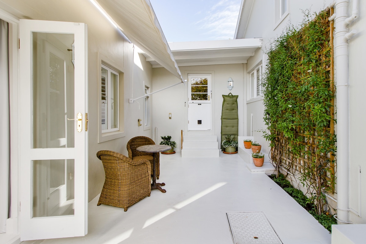 Great for short business stays. Rare long weekend cancellation from 3-8 February. Pass through the shaker doors and into a wet-room-style bathroom with local Ecoco toiletries and heated towel rails. There is a ceiling fan for hot days. Then have breakfast on the padded seats in the private courtyard, washed down with some Nespresso topped with frothed milk. Should you want an early breakfast, I can provide a delicious basket of fresh items in your fridge the night before. Also I can supply a small basket of hot muffins or scones in time for your meal. There will be an extra charge for this depending on what you would like. THE STUDIO The studio (which is ideal for a couple or a single person) while small in space is compact( 19 square metres) and immaculately finished White wooden floorboards, high white wooden ceilings and white walls give it a feeling of spaciousness. White Plantation shutters give you privacy and complete the picture. Two comfortable armchairs, headboard and lampshades are in neutral linen, and the bed, which is a queen size, is dressed in imported White Company bed linen. White Company has also supplied the cotton gowns for your comfort at the end of long day sightseeing. Wi fi is installed to connect you to the outside world and a TV with a full DSTV package can be watched from the comfort of your armchair or your bed. Behind shaker doors there is a wet room style bathroom with shower, heated towel rails and toilet. Toiletries are hand-made locally by Ecoco, using personally selected essential oils. Feel free to really indulge yourself in these products. Inside the main room there is a kitchenette with white counters and shaker style cupboards. A Nespresso machine with a range of coffee types and a milk frother to replace your favourite barista . Other appliances include a microwave, mini fridge, toaster and kettle. Meals can be enjoyed either in your own private courtyard in good weather or at a very comfortable counter inside the studio. The Courtyard is planted with herbs, roses and green creepers. Here you can lounge on long cushions and sit at a bistro style table in comfortable chairs under a café style awning. The lower garden is for the guests to use. It edges onto the Green belt. There is rustic table and chairs for you to sit and enjoy a picnic or a cup of coffee etc, surrounded by greenery and birdlife. A gate in the garden links you to a number of river walks.This is perfect for Birdwatchers as well. The Studio is private and has a courtyard. The guest/s will have their own parking and access. I am happy to interact as much or as a little as the guests please. I enjoy people , but I do respect their privacy. I will be present when the guests are here. Follow mapped hiking trails right from the gate of this property in the verdant Constantia Valley. Mountains and vineyards are all around, with wide-ranging shopping areas just down the road. Take the nearby highway to beaches and Cape Town. You will need a hired car, or rely on taxis such as Uber. Bicycles are available should you wish to ride along the Green belt. The studio is ideal for a couple or for a single person. The Studio is also ideal for the single Business Person or Couple. Should you wish me to stock your fridge for breakfast/snacks etc I am happy to do this. Please respect the privacy of the guests in the cottage. ALTHOUGH WE ARE EXPERIENCING A DROUGHT HERE IN THE CAPE, HERE AT 33 STRAWBERRY LANE WE HAVE OUR OWN UNDERGROUND WATER SOURCE. However we would ask you to still be cautious with your water use.