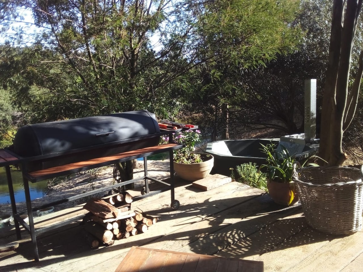Our Gypsy Bowtop Caravan was handmade by a wonderful local craftsman. Made with Spruce and Cypress wood, and a canvas top covering the characteristic bows, it is a unique and very comfortable space. It is self-contained with a double bed, a bathroom, a dinette and kitchenette with a small wood-burning stove. Windows in the canvas give views of the garden and mountains. There is a private deck with seating and a Weber outside. Situated lower in our garden, it is a restful and peaceful space.