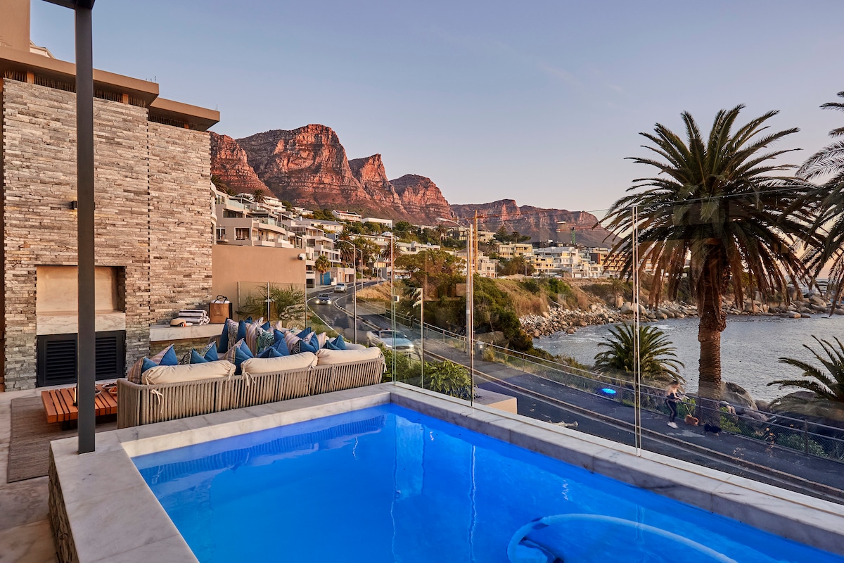Enjoy sun-kissed days from the hot tub and pool deck. Beach House is a beautifully finished, luxurious, fully-serviced 5 bedroom villa with superb sea and mountain views from the living and dining areas and from most of its spacious bedrooms. With the constant sound of the waves, the villa is ideal for beach lovers with Camps Bay's long sandy beach being just a short walk across the road via the private steps from the pool deck in front of the property.