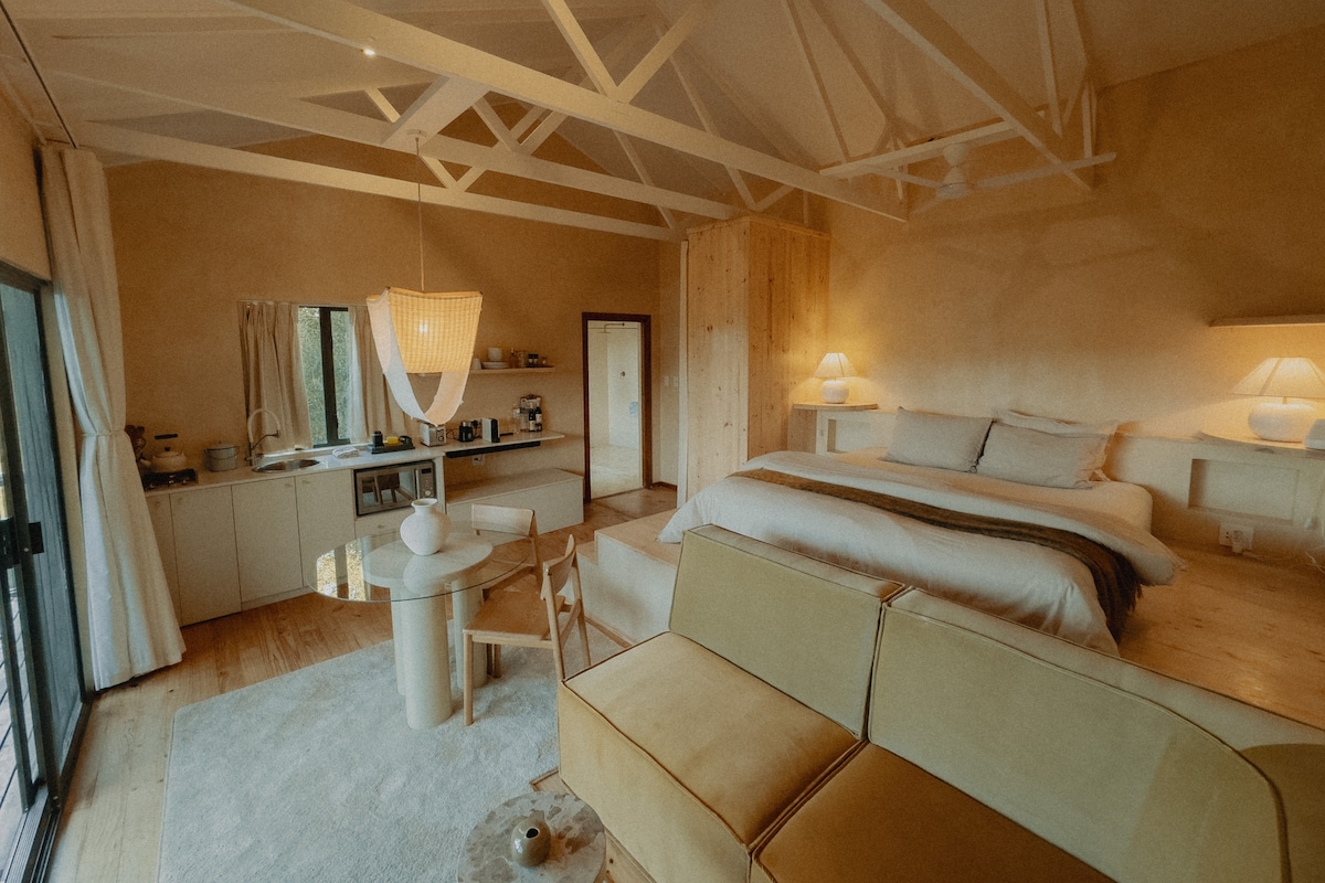 Our three Sun Cabins boast surreal views and intentional interiors. - 45 Sqm Wood Cabin - Hosts 2 people max, 1 Kingsize bed - Induction stove, convection oven, equipped kitchen - Nesspresso machine and milk frothier with two capsules - Bathroom with exquisite bath and shower view, organic toiletries, hair dryer and robe - Large deck with wood-fired hot tub and wood braai