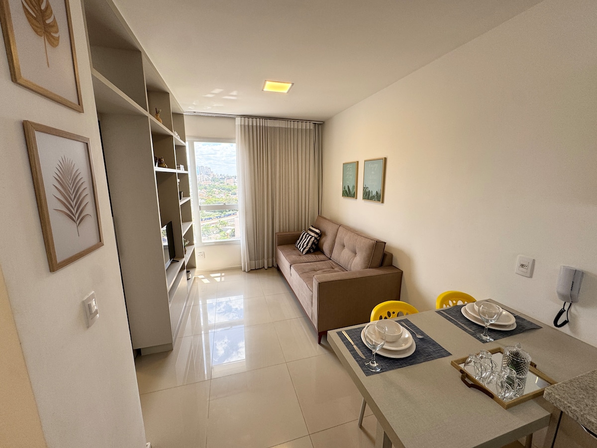 Flat Maravilhoso e na melhor localização de Goiânia - Metropolitan Sidney - Jardim Goiás Tenha uma estadia agradável e inesquecível no Metropolitan Sidney, um dos prédios mais procurados por hóspedes. Com localização privilegiada, próximo ao Shopping Flamboyant. Fácil acesso ao Aeroporto, Mall no mezanino com restaurantes e conveniência. O apartamento é completo, cozinha equipada com todos os utensílios necessários ,TV, ar condicionado, Wi-Fi, cama queen, roupa de cama e vaga de garagem.