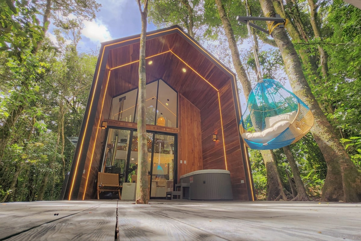 Cabaña tipo Bali con mas de 2 hectáreas de bosque y rio privados,Jacuzzi caliente, wifi , clima primaveral, que combina el lujo y la naturaleza, , deck junto al rio ,fogata, videproyector tipo cine, ducha con vista a la naturaleza, zona de trabajo y lectura , hermosa iluminación nocturna ,cocina y zona BBQ, asoleadoras y muchas otros detalles pensados para brindarte una experiencia unica e invitarte a desacelerar y reconectar contigo y con la naturaleza
