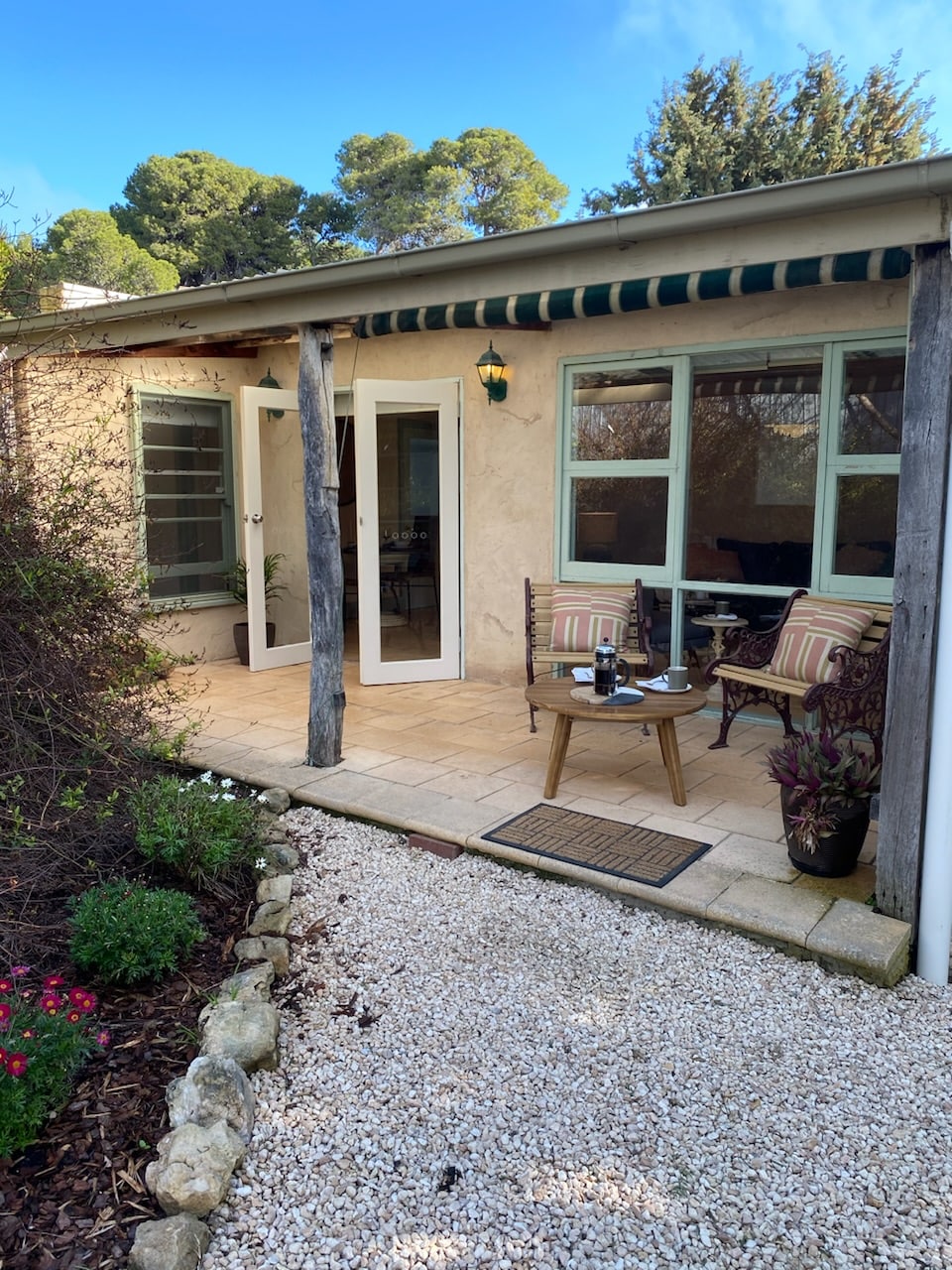 Our property sits in a beautiful open space, surrounded by paddocks and vineyards. Our boutique accommodation is at the rear of the house and is two separate studios. It has been converted from a stone barn and has the charm of age but with the comforts of modern life. Each studio contains a luxurious bedroom/living area and separate bathroom. Our property is also used as a wedding venue and the gardens are yours to enjoy. Our new cellar door is nearby for you to sample some wine.
