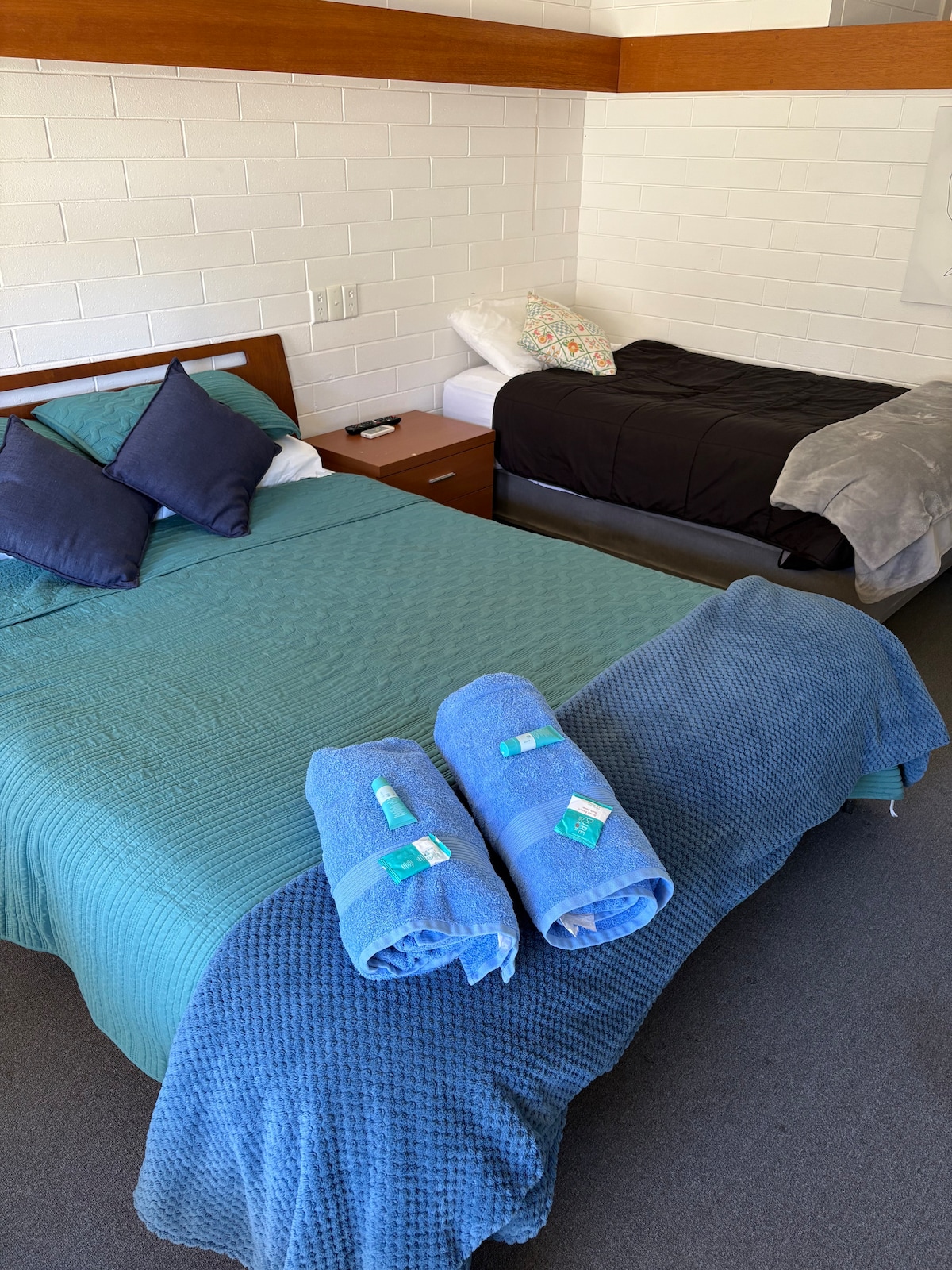 Our cozy Queen Room is perfect for 1-2 guests, featuring a comfortable queen bed and a fully equipped kitchenette with a toaster, microwave, and bar fridge. Enjoy the convenience of tea and coffee making facilities, along with complimentary toiletries like shampoo, conditioner, and soaps. This room features a private patio shared with the room next door. Whether you're here for business or leisure, this room offers everything you need for a relaxing stay.