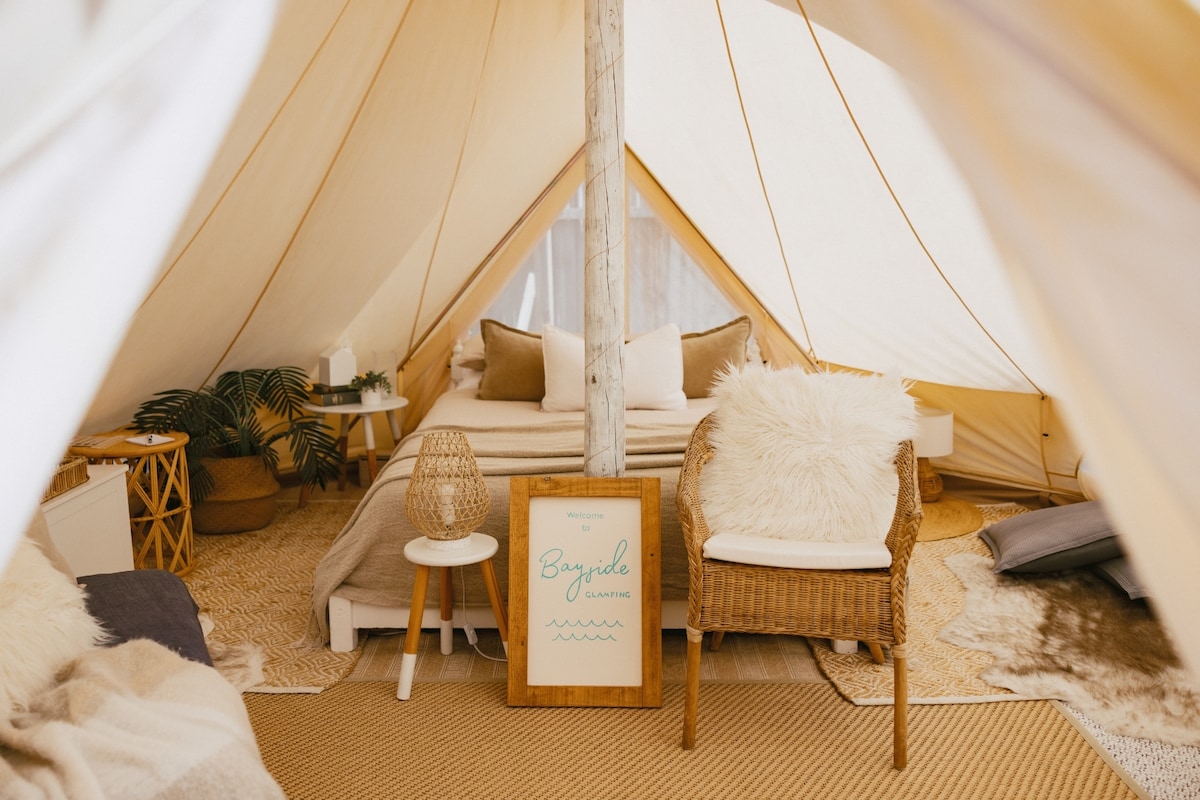 Wake up to the sound of waves crashing and leave your worries at the door! Our beautifully cozy, romantic glamping tent is the perfect place to switch off and unwind. Just bring your loved one, and we'll take care of the rest. Enjoy a hand selected Charcuterie waiting for your arrival, and why not add a bottle of local award winning wine to match! With a queen bed, indoor & outdoor dining, cooking facilities and tea/coffee station, Glamping at Wrights Bay is the complete package for everyone.