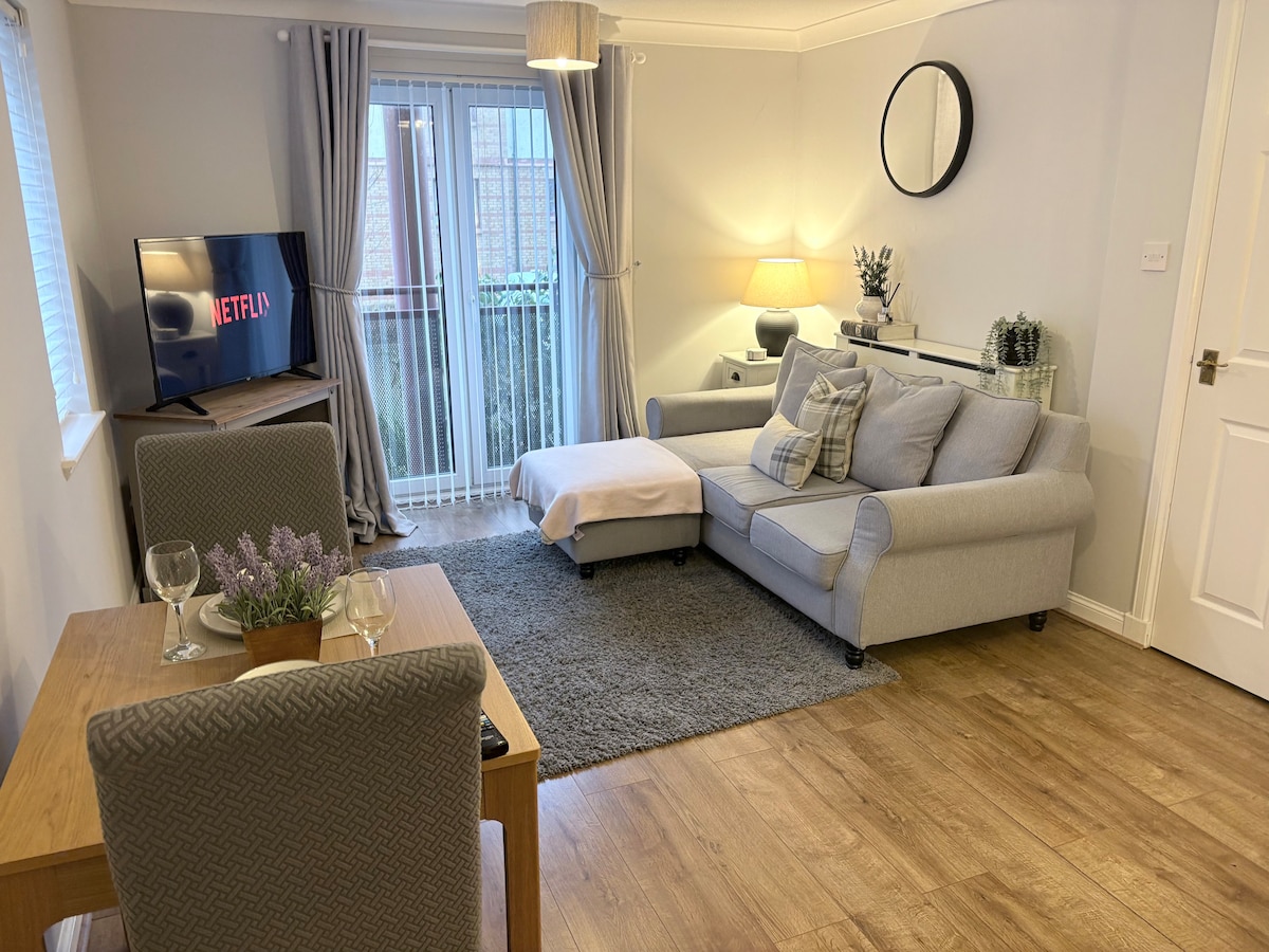 Riverside View is a modern 2 bedroom apartment, on the ground floor and is situated on the banks of the River Ayr. It has a private patio overlooking the River which captures the sun from morning until evening. The apartment is situated in central Ayr and only a short walk away from the bars, restaurants and shops. The apartment is cosy and comfortable, has free WIFI with large smart t.v and also small smart t.v in front bedroom, fully equiped kitchen with washing machine and coffee machine too