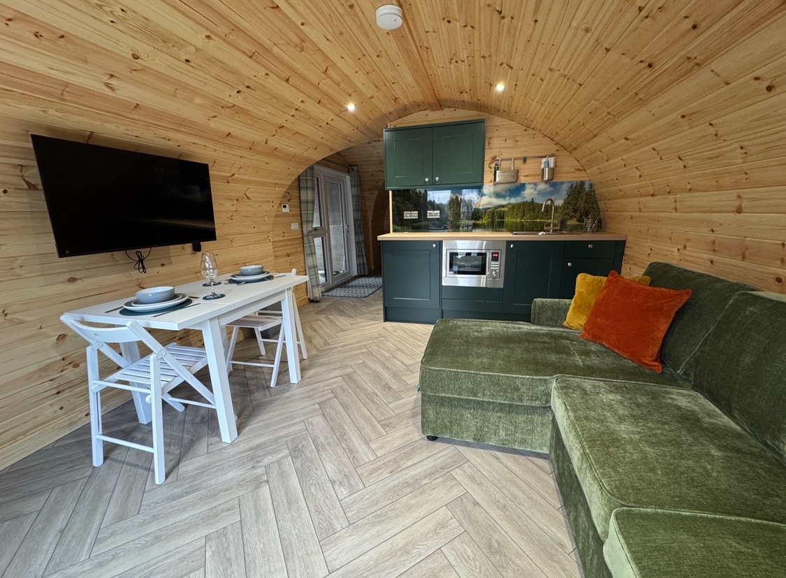 The Dark Skies Mega Pod with a 2 person electric hot tub is nestled amongst the Carrick Hills in South Ayrshire, South West Scotland. Features :- En-suite shower, sink and WC Fixed double bed Bed linen and towels (2 per person) Large sofa bed Kitchenette with fridge, microwave, kettle, toaster and sink Cutlery and crockery Dining table and chairs Flat screen TV/DVD Electric sockets with USB charging points Sub zero insulation and under floor heating so they will be warm and cosy