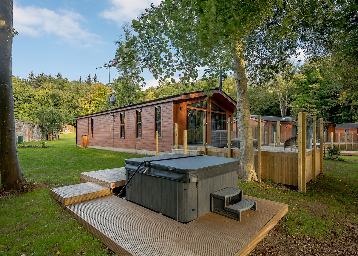 Ground Floor: 2 steps to entrance. all on the ground floor. Living room: With wood burner and smart TV. Kitchen/dining room: With electric cooker, microwave, and fridge, Bedroom: With super king-size bed. Shower room: With shower cubicle and toilet. Air Conditioning, electricity, bed linen, towels, bath robes and Wi-Fi included. Initial fuel for wood burner included. Welcome pack, including prosecco, tea, coffee, milk, bread, butter, and cereals. Raised decking with hot tub for 2 private