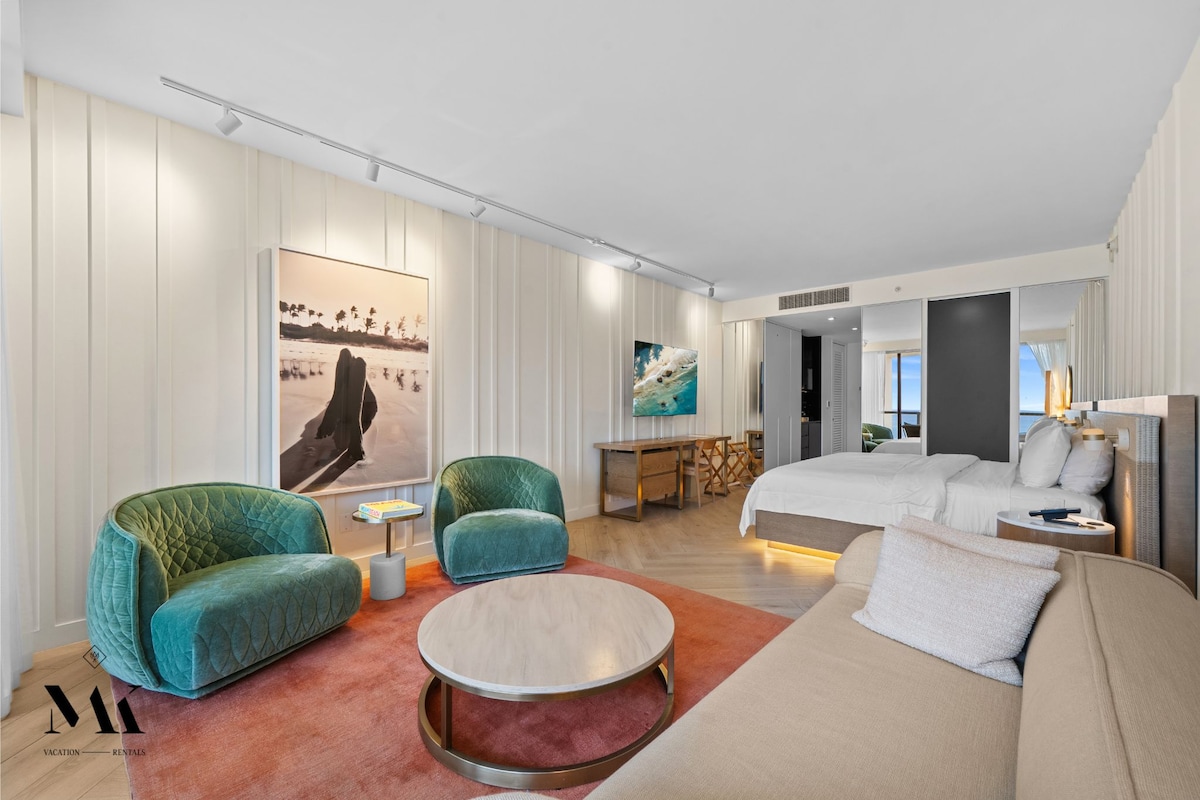 Enjoy this modern, open floor plan and ocean view Jr. Suite at the world renowned Fontainebleau resort. This unit is located in the Sorrento tower which is closest to the beach, you have a gorgeous balcony on the 10th floor that gives you ocean views while also viewing the Miami skyline. This Studio includes: -2 Lapis Spa passes. -Free high speed internet. -gym access, with Beach Views! -Direct beach access with loungers See below for cleaning fee.