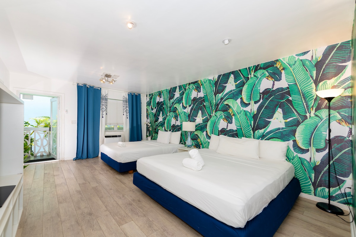 Coastal Breeze units bring in the freshness of the sea and the easy, seaside vibe of Miami. Each elegant beige-and-blue apartment offers a comfortable Queen-sized bed, an attractive and homey living area perfect for family or friends, a modern writing desk so you can mix in some business with pleasure, and all the space you’ll want for an airy, relaxing sanctuary in the ever-busy Ocean Drive.