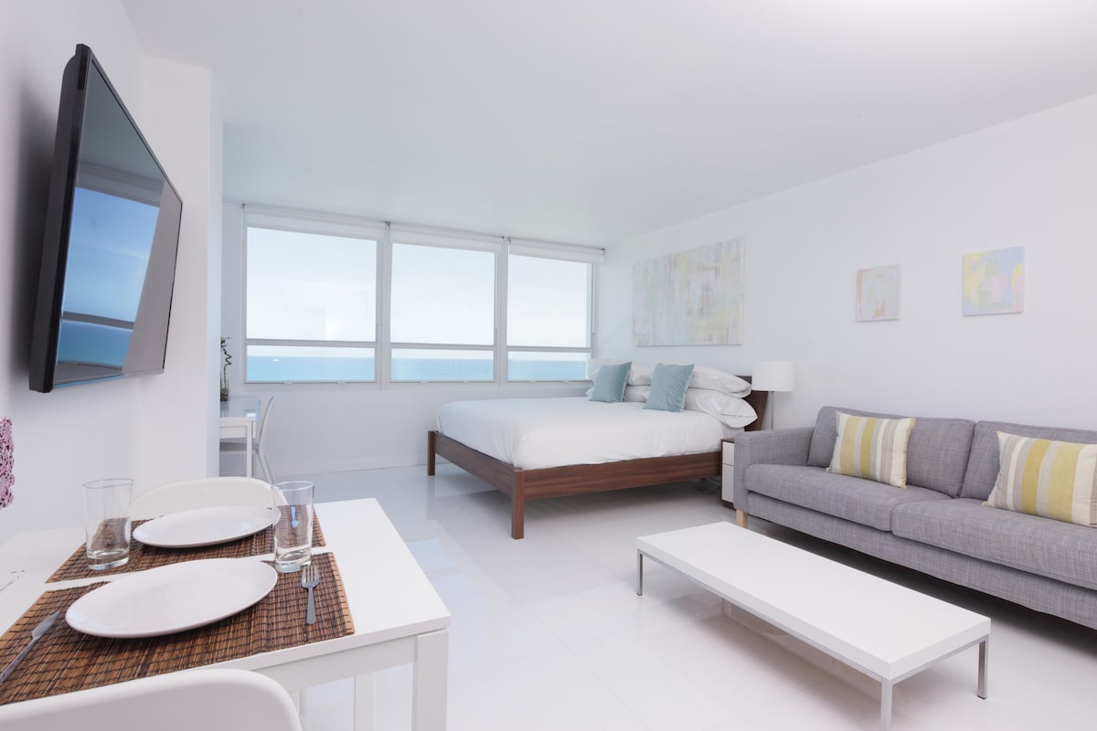Welcome to Pure Miami Beach! Escape to this modern beachfront studio in sunny Miami Beach, Florida, with breathtaking 180° ocean views. Relax in a plush king-size bed, stream on a 65” 4K Samsung TV, or work with private 300mb WiFi and ethernet connections. Stay fit in the renovated gym, then unwind by the sparkling pool with direct beach access, lounge chairs, and a tiki bar for tropical drinks and bites. Free parking, luxury finishes, and endless ocean vibes make this the ultimate getaway!