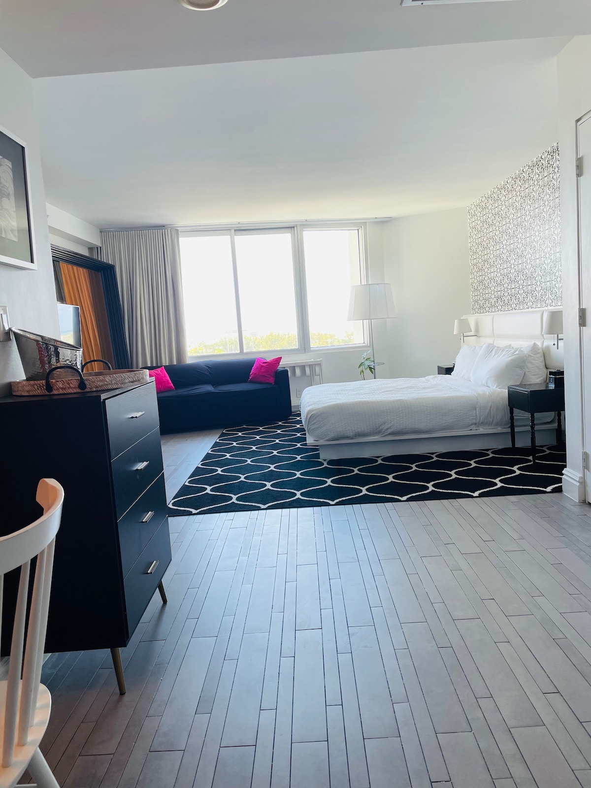 Entire luxury condo at Quadro in the Miami Design District. Fully furnished & equipped - Free parking, coffee, Wi-Fi & cable. The building features resort-style amenities in the 6th floor including a fitness center with a yoga/spinning studio, a lounge with co-working/conference areas & a game room, an outdoor dining area with a summer kitchen & BBQ's, a pool with cabanas overlooking Biscayne Bay.10-min drive to Miami’s airport, 15-min drive to Miami Beach. Walk to Wynwood and Midtown.
