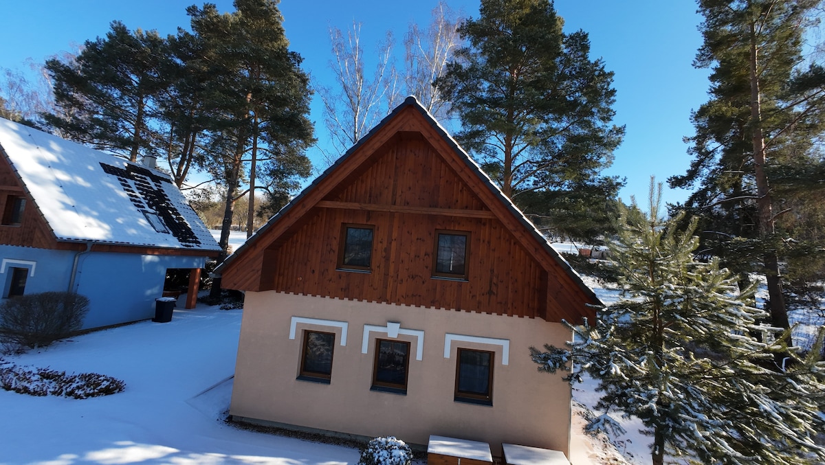 Přijeďte si odpočinout do nového rekreačního domu obklopeného borovicovými lesy, borůvčím a dvěma rybníky. Zažijte ticho a klid v centru jihočeské přírody. Kapacita: 7 - 8 osob, 3 ložnice. Koupelna se sprchovým koutem, 2 x samostatné WC. Prostorné obývací přízemí, plně vybavená kuchyň. Sedací souprava, velký jídelní stůl (až 12 osob pro případ rezervace s Beach House Buxusson) a společného posezení, TV, velká krytá terasa, gril. Oplocený vlastní pozemek, uzamykatelná kolárna.
