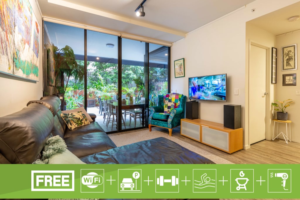 Welcome to your urban oasis! This studio features a rooftop private garden terrace with hinterland views. Enjoy the open-plan design with floor-to-ceiling windows, a kitchenette, dining, lounge & bedroom space. Perfect for work or relaxation, yoga or small gatherings. Has a study table & large dining table. Ideal location to Southbank, The Gabba, QPAC, Riverstage, Suncorp Stadium & the Convention Centre. Includes a 55" smart TV + free Netflix & free car parking. A perfect city retreat!